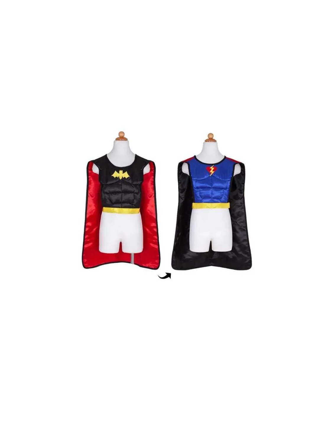 Découvrez la Cape tunique réversible de super-héros avec masque de taille 4 à 7 ans de Great Pretenders, un magnifique costume pour devenir 2 super héros différents avec le même déguisement.