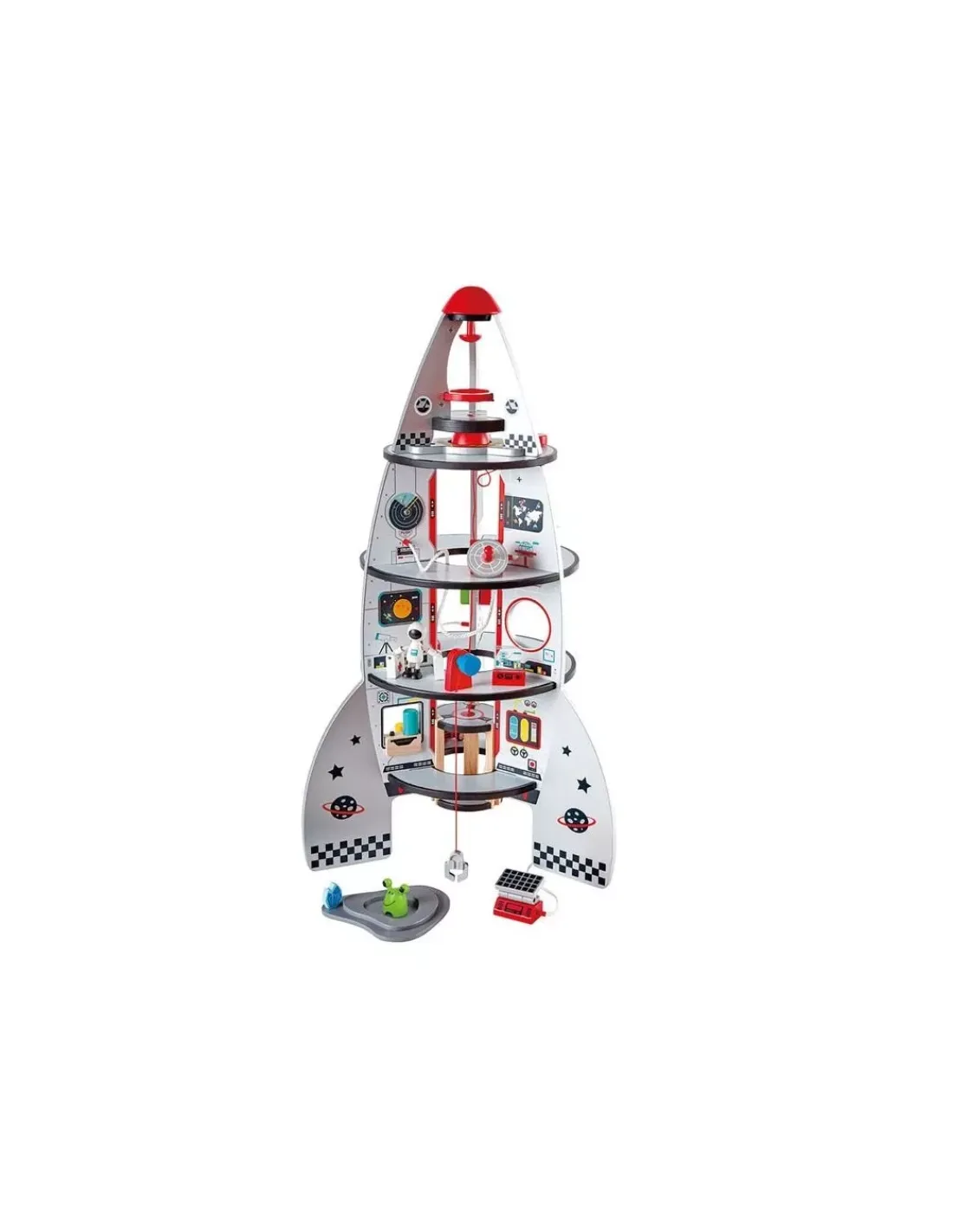 Découvrez la fusée spatiale de Hape, une grande fusée en bois de 4 étages avec plein d’accessoires pour s’imaginer de belles histoires de cosmonautes et d’expéditions dans le système solaire.