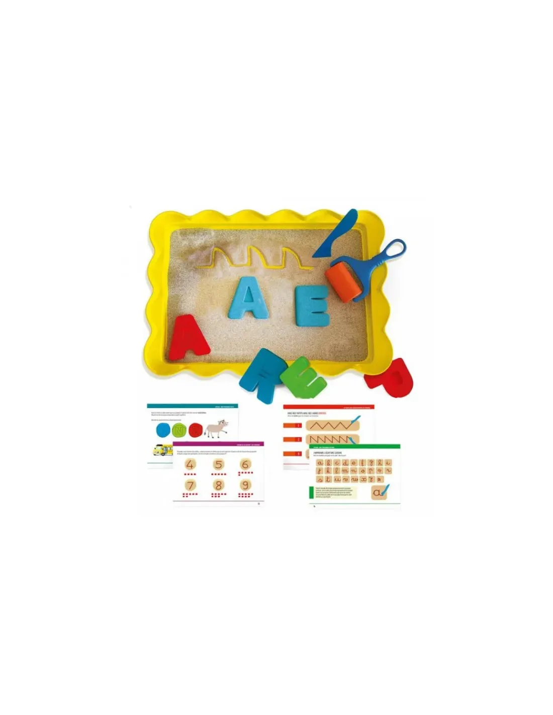 Le coffret contient 1 bac en plastique, 700 grammes de sable de différentes couleurs, 1 rouleau, 26 moules ABC, 1 cutter en plastique et 1 guide pédagogique.