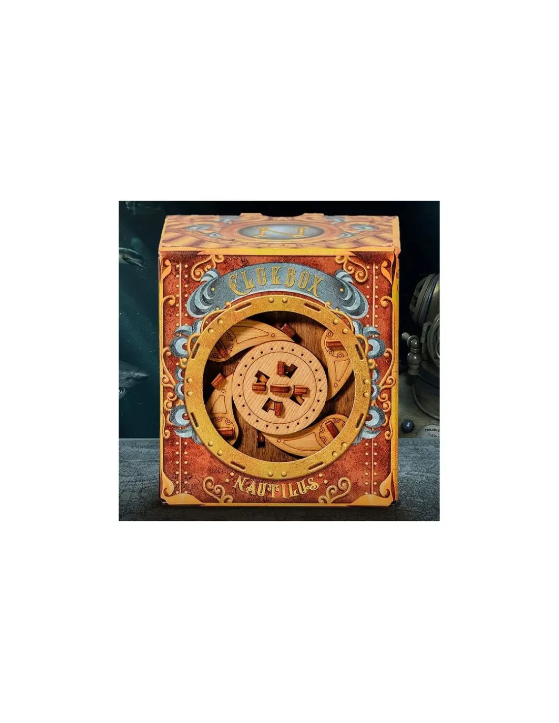 Découvrez le casse-tête 3D Cluebox Nautilus du capitaine Nemo, une boîte à énigmes interactive avec diverses énigmes et tâches qui doivent être résolues les unes après les autres pour ouvrir la boîte. Une escape room au format pratique tout en bois à partir de 14 ans. Votre propre petite salle d’évasion à la maison, une boite à indices que vous allez tenter d’ouvrir puis que vous pourrez remonter.