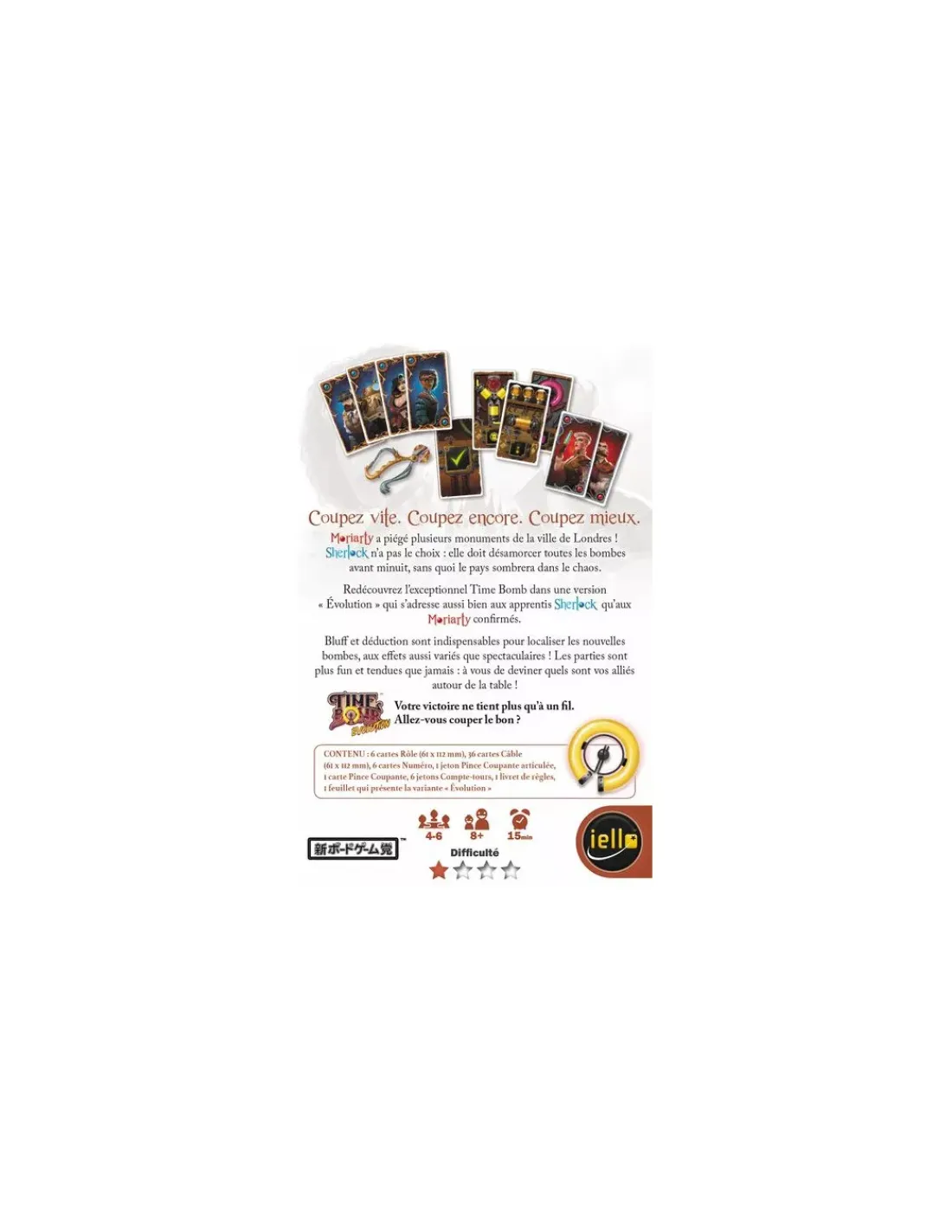 Tout en conservant les principes qui ont fait le succès de son illustre prédécesseur, Time Bomb Évolution s’adresse aussi bien aux apprentis Sherlocks qu’aux habitués de cet exceptionnel jeu de bluff. Avec cette version Évolution, Time Bomb gagne désormais une intensité nouvelle avec de multiples bombes à désamorcer, ainsi que des effets dramatiques susceptibles de se déclencher à chaque désamorçage.