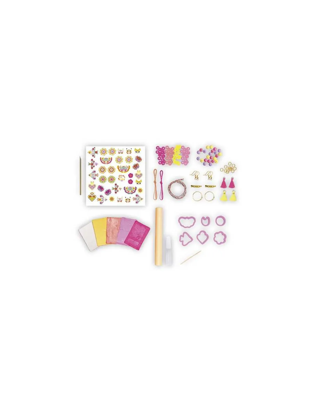 Ce coffret créatif contient 5 blocs de pâte polymère à cuire au four (blanc, jaune, rose, rose fluo, corail), 1 rouleau de modelage et 1 cure-dent, 1 tube de colle, 6 emporte-pièces sur-mesure, du fil orange et rose, du fil tressé, 2 supports de bague, 4 supports de boucles d’oreille, 22 anneaux de connexion, 4 pompons, 64 perles heishis, 24 perles rondes et 1 planche de décalcomanies avec un outil en bois.