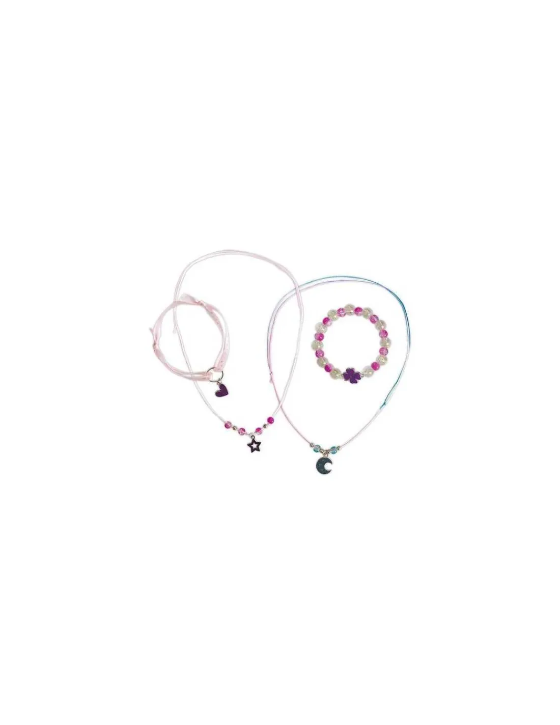 Ce coffret ludique contient tout le nécessaire pour réaliser 2 colliers et 2 bracelets : 4 breloques spectaculaires en forme de lune, cœur, trèfle et étoile, qui émerveilleront par leurs changements de couleur, ainsi que des perles scintillantes et colorées (11 pailletées, 16 roses, 2 bleues et 6 argentées).