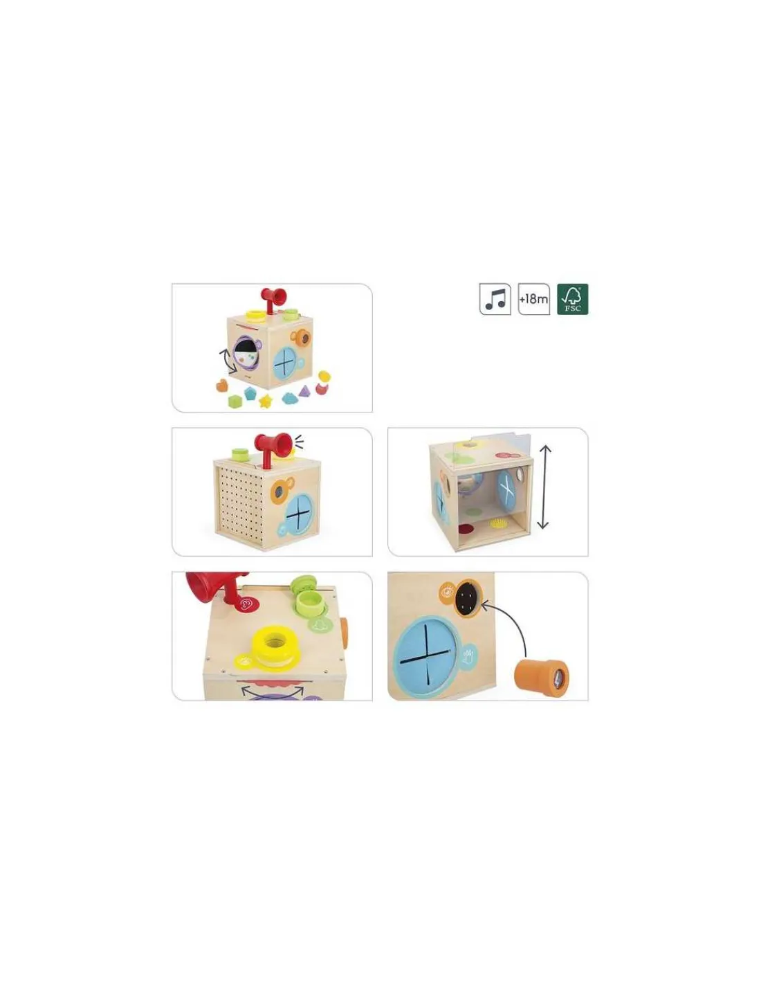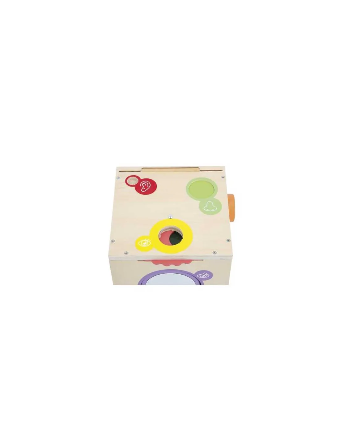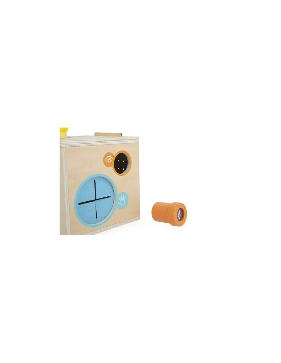 Cette boîte ludique propose une exploration complète des sens grâce à ses 12 accessoires soigneusement intégrés. L’ouïe est stimulée grâce à un mégaphone qui permet aux enfants d’expérimenter de légères déformations sonores pour une découverte amusante de la voix. Le toucher est mis à l’honneur avec deux entrées situées de chaque côté de la boîte, permettant aux enfants de glisser leurs mains à l’aveugle pour deviner les objets placés à l’intérieur.