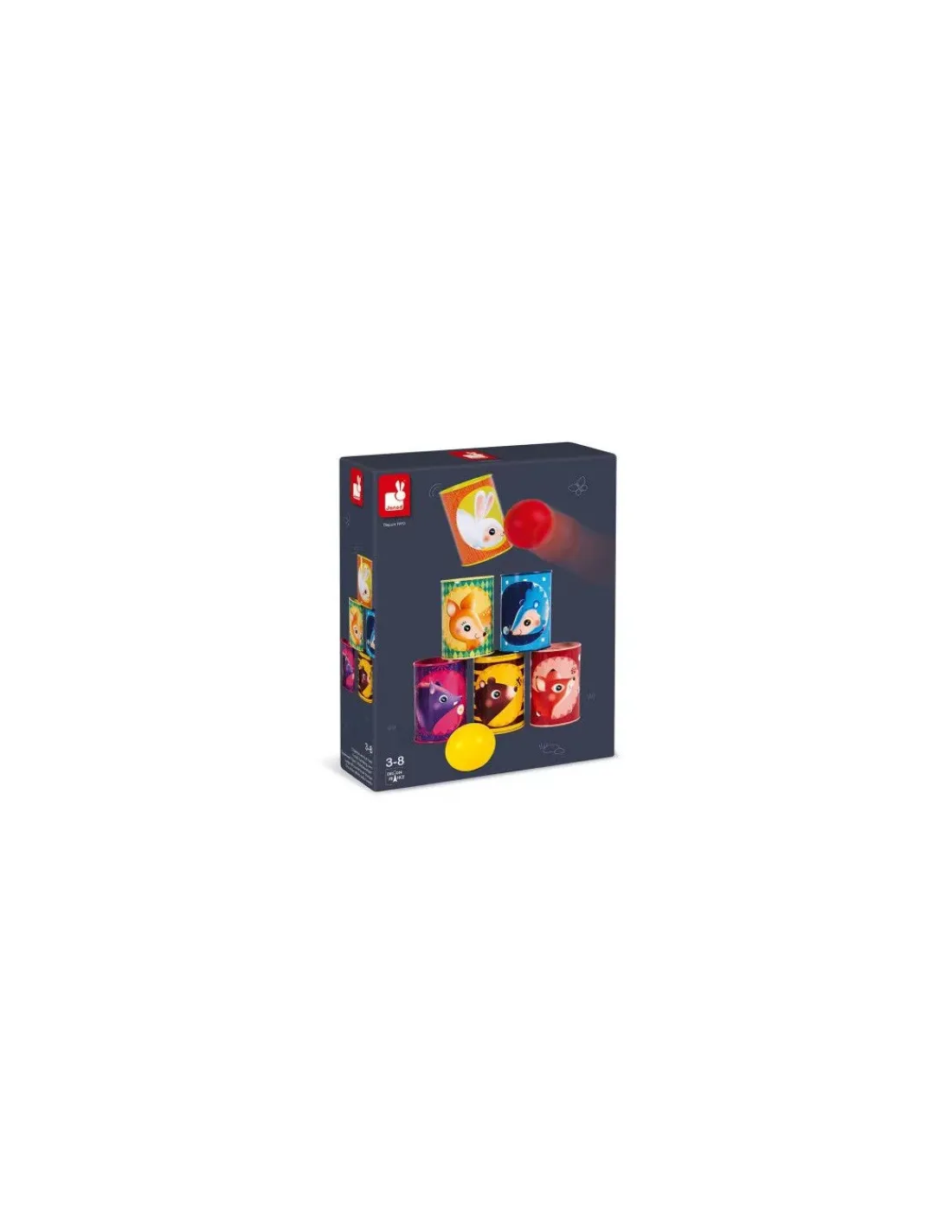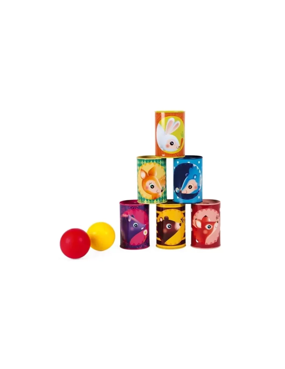 Découvrez le jeu de chamboul tout forêt de Janod, un jeu d’adresse incontournable lors des kermesses et des anniversaires. 6 boites de métal et 2 balles en mousse pour essayer de tout faire tomber pour les enfants à partir de 3 ans.