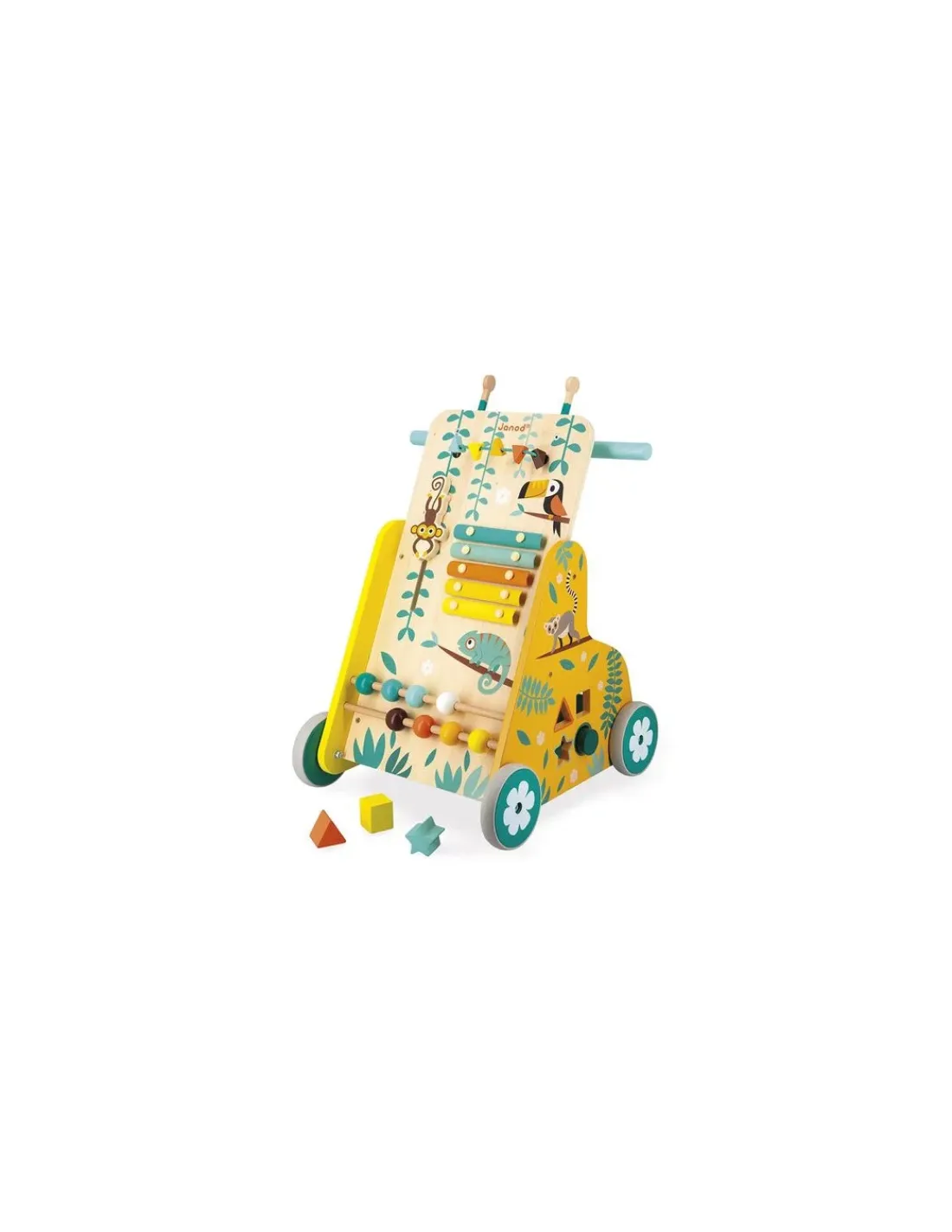 Un formidable jouet en bois pour éveiller votre bébé et l’accompagner dans ses premiers pas. Ce chariot de marche très coloré regroupe 6 activités pour accompagner l’enfant dans ses premiers apprentissages avec bouliers, boîte à formes, singe à glisser, labyrinthe, perles et xylophone.