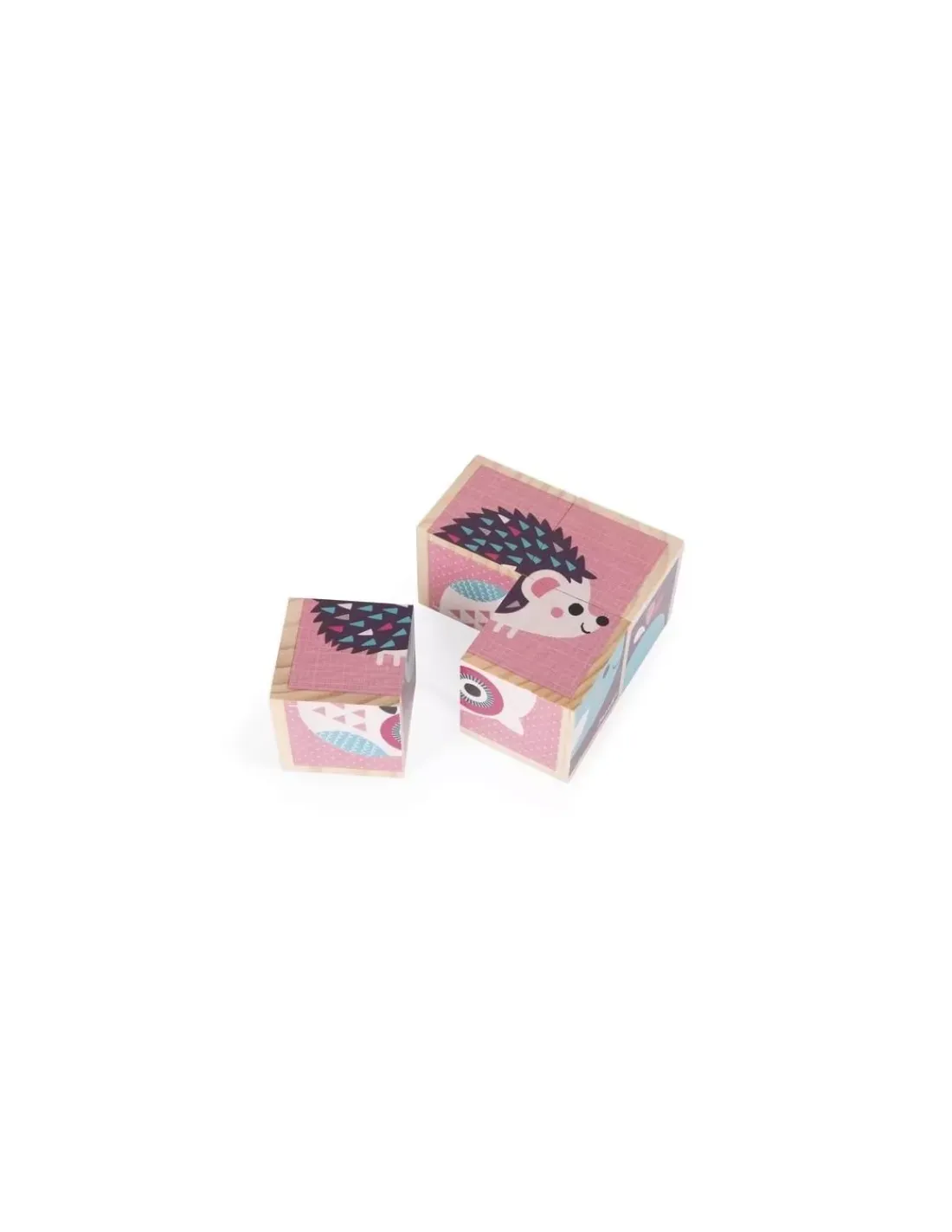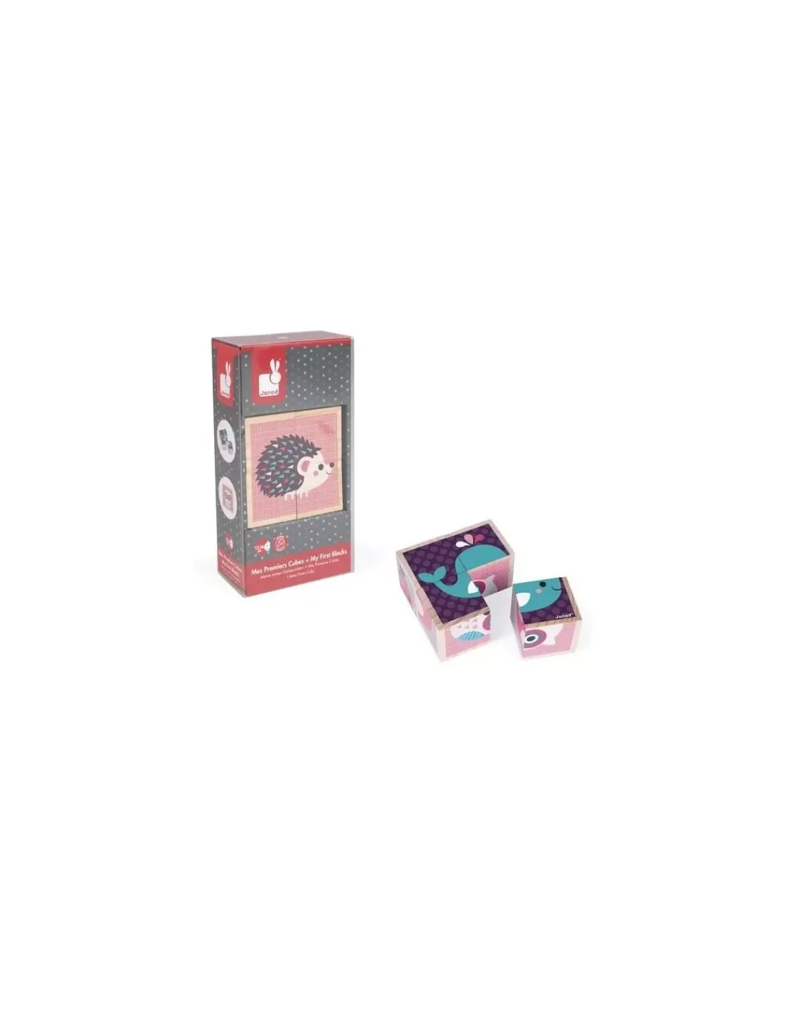 Découvrez les cubes en bois « bébés animaux » de Janod, 4 cubes en bois massif avec 6 illustrations au couleurs douces sur le thème des bébés animaux : pingouin, hibou, papillon, hérisson, baleine et oiseau. Des cubes pour les enfants de 1 à 3 ans.