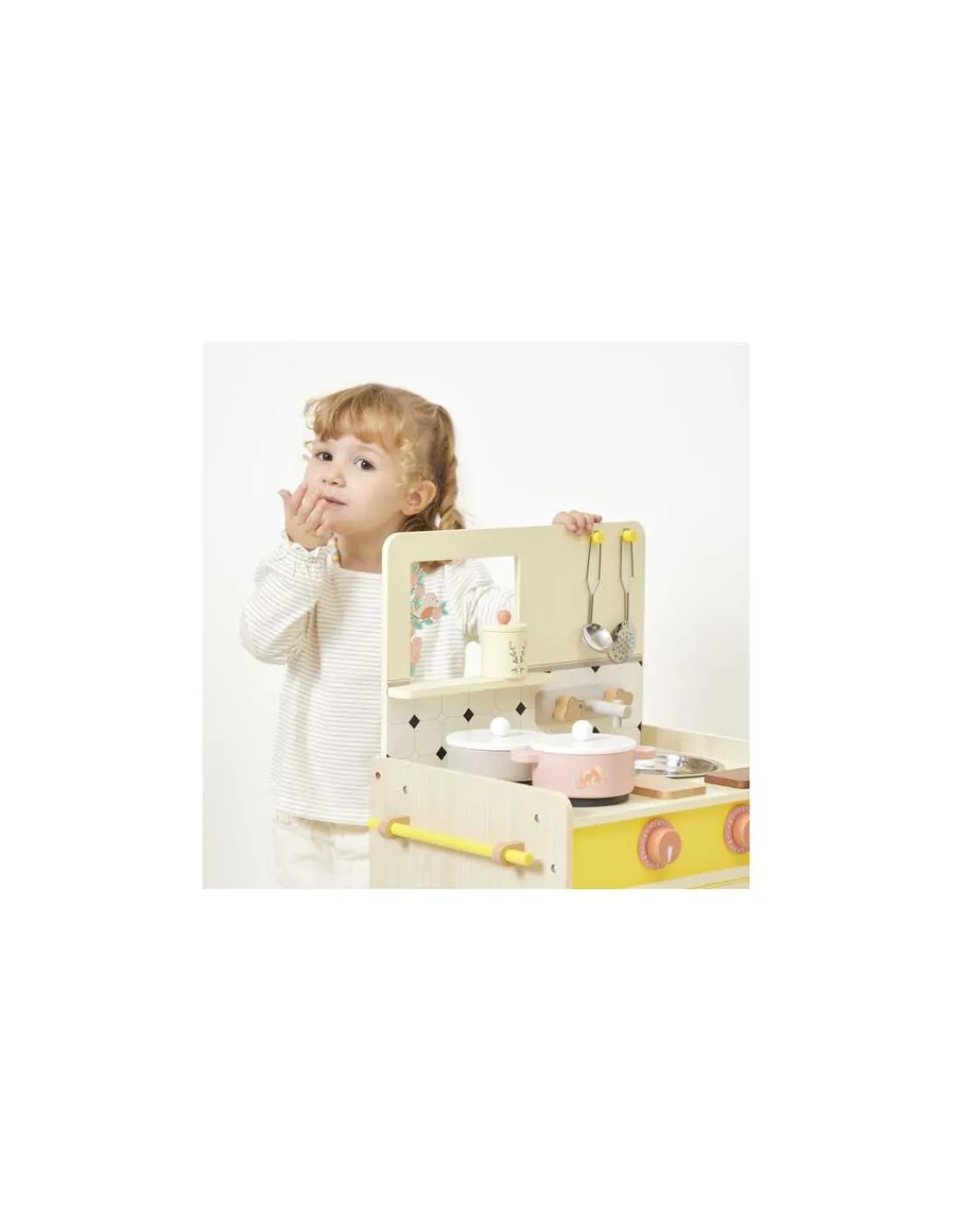 Cette cuisine aux teintes chaleureuses de jaune est équipée d’accessoires variés, de boutons rotatifs et de sons pour simuler de vrais bruits de cuisson. Complet et fonctionnel, ce jouet en bois propose une multitude d’accessoires : une salière, une poivrière, une poêle et une casserole avec leurs couvercles, un écumoire, une louche, un pot à épices, une grande panière, deux planches à découper, et même un joli décor pour la fenêtre.