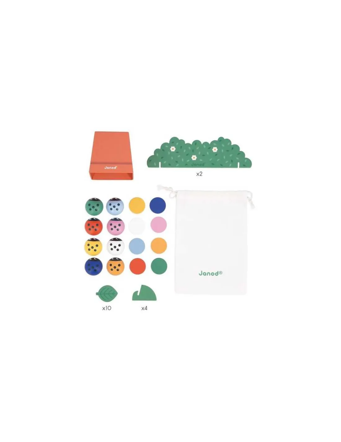 Le coffret comprend 8 coccinelles, 16 jetons en bois, 1 pot de fleur, 2 buissons et 10 feuilles « trophées » en carton et un sac en coton pour ranger les accessoires.