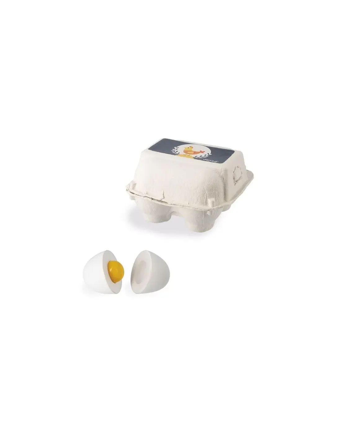 Découvrez la dinette Les oeufs du petit chef de Janod, une boite de 4 oeufs en bois pour jouer autour de la cuisine avec ses copains ou ses poupées à partir de 3 ans.
