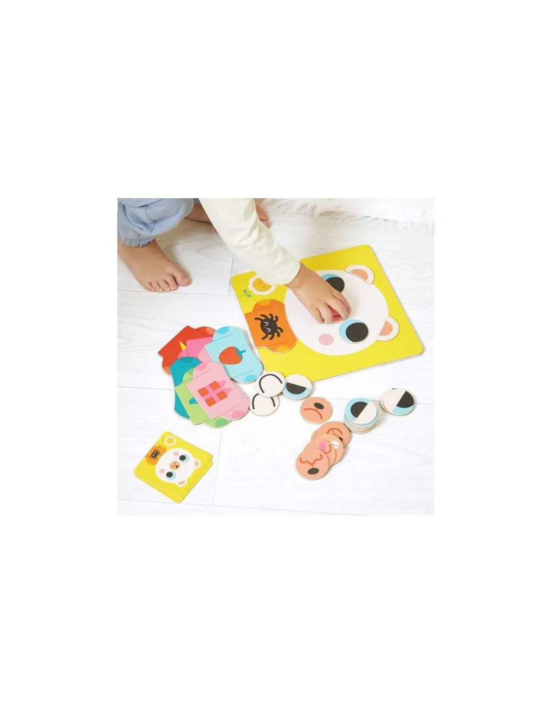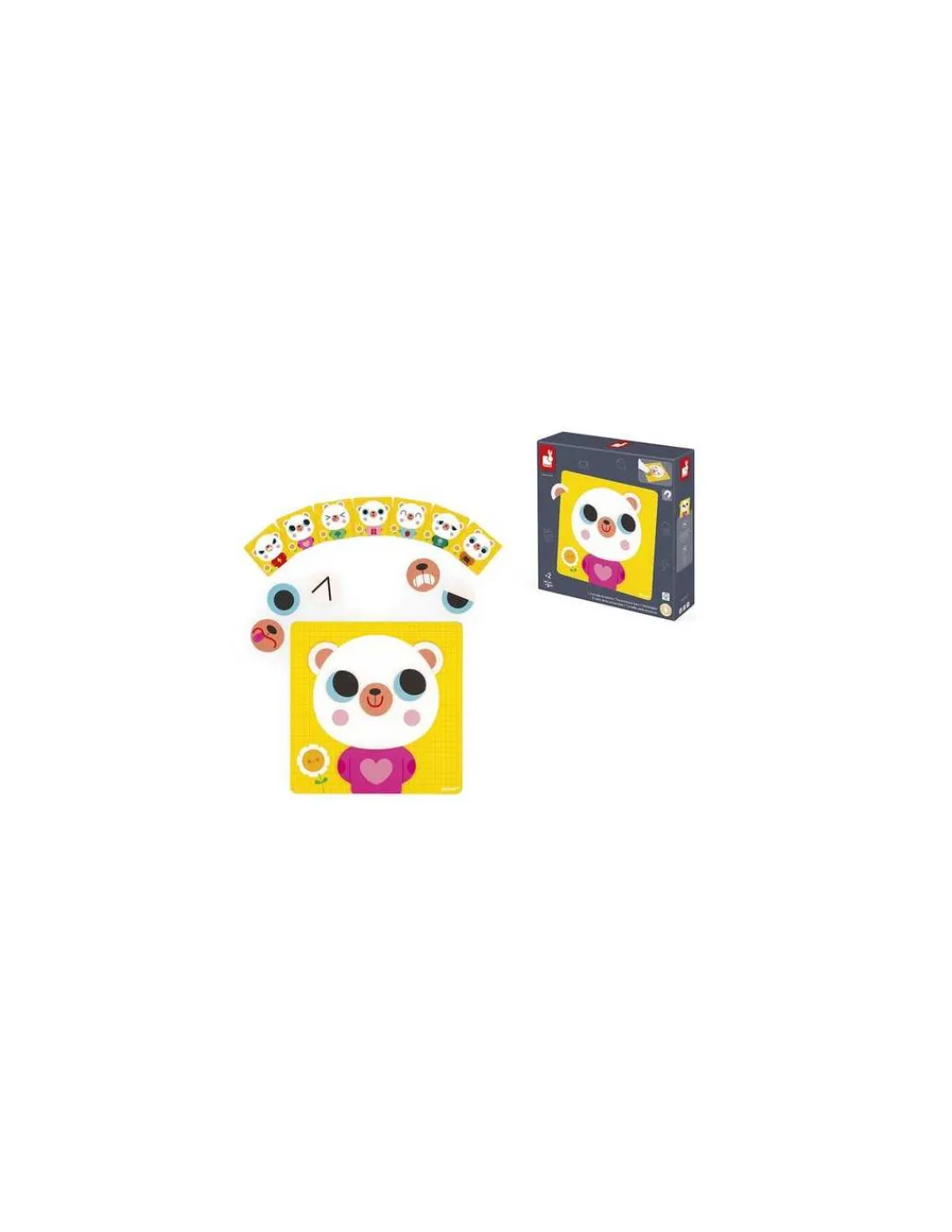 Ce coffret ludique et pédagogique comprend un plateau en bois illustré et 30 magnets permettant de recréer les expressions et les tenues de l’ours en suivant les 7 cartes modèles fournies.