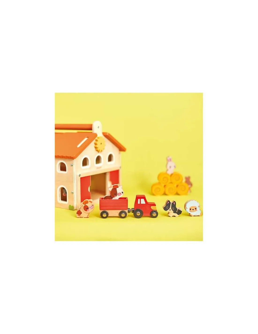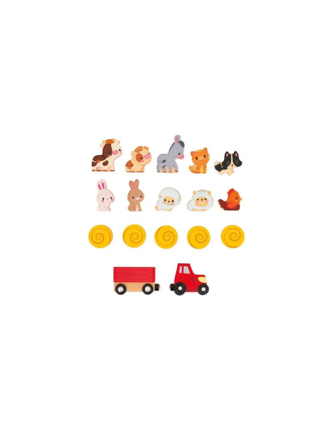 Un jouet en bois livré avec 17 accessoires pour jouer et inventer de belles histoires : 10 animaux, 5 ballots de pailles et un tracteur avec remorque magnétique.