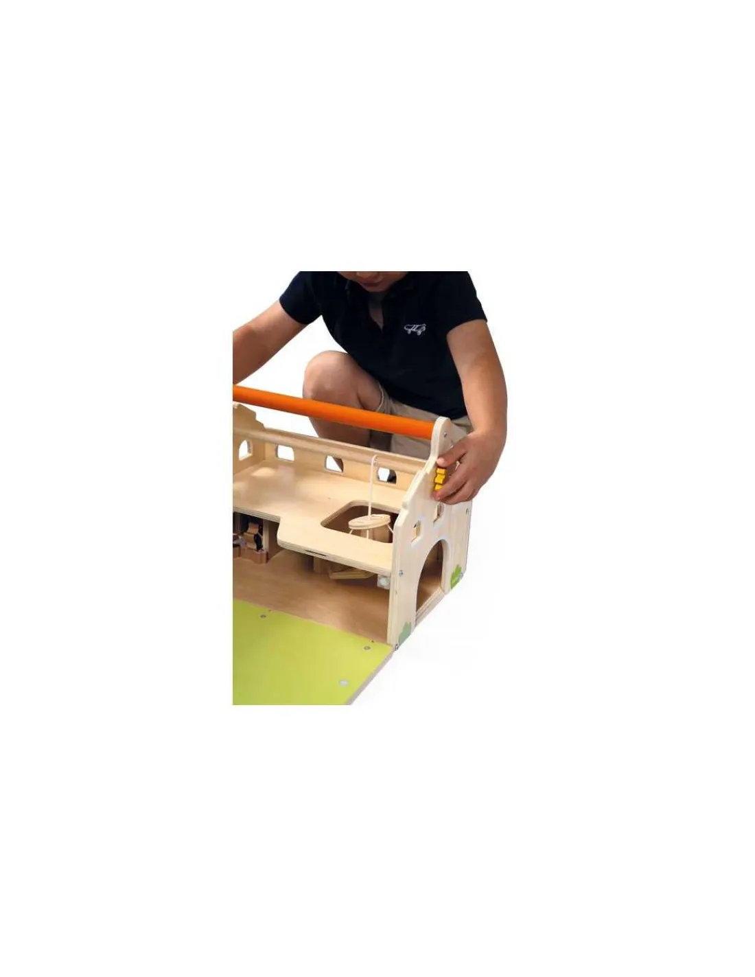Cette grande ferme en bois possède 2 pans de toit amovibles, des portes coulissantes et une porte à charnière à élastique. Elle s’ouvre et se ferme grâce à un système magnétique. À l’intérieur, votre enfant découvrira un ascenseur qui lui permettra de monter les animaux ou les ballots de pailles à l’étage.