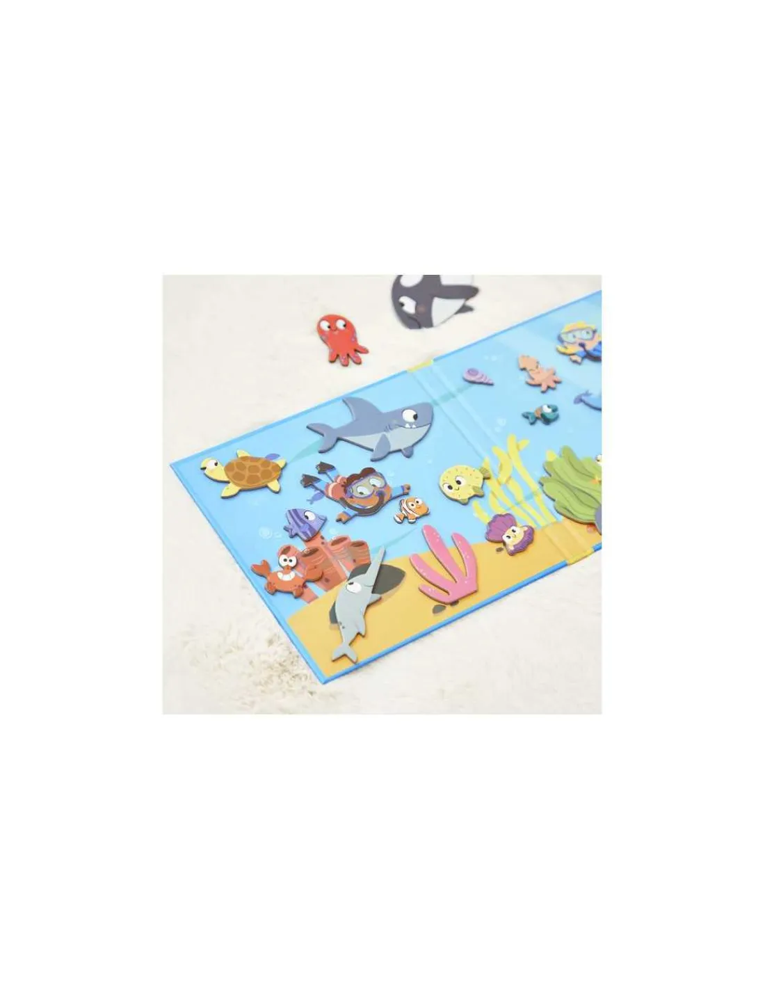 En ouvrant ce livre magnétique, votre enfant découvrira un décor représentant l’océan, sur lequel il placera les pièces aimantées pour reconstituer des scènes avec des animaux marins : une baleine, un requin, un dauphin, une tortue, des poissons…