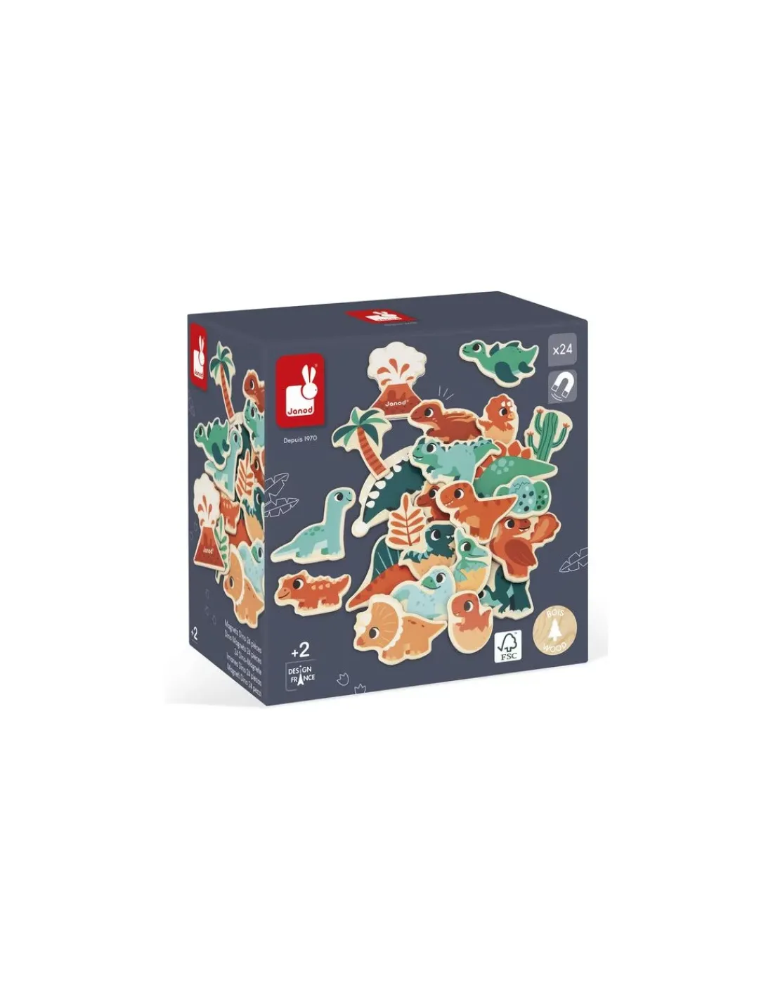Découvrez le coffret Magnets Dino de Janod, un set de 24 magnets en bois pour les enfants à partir de 2 ans.