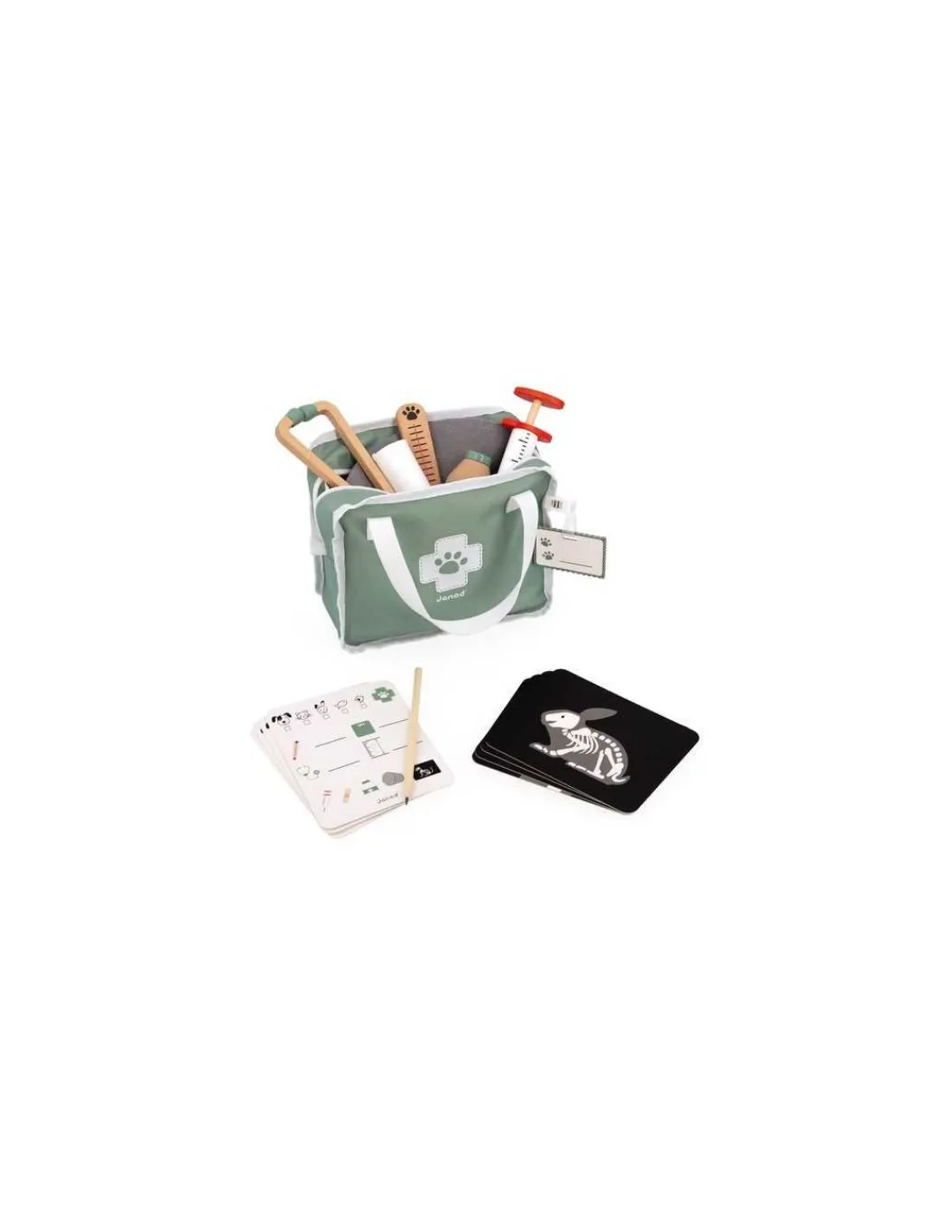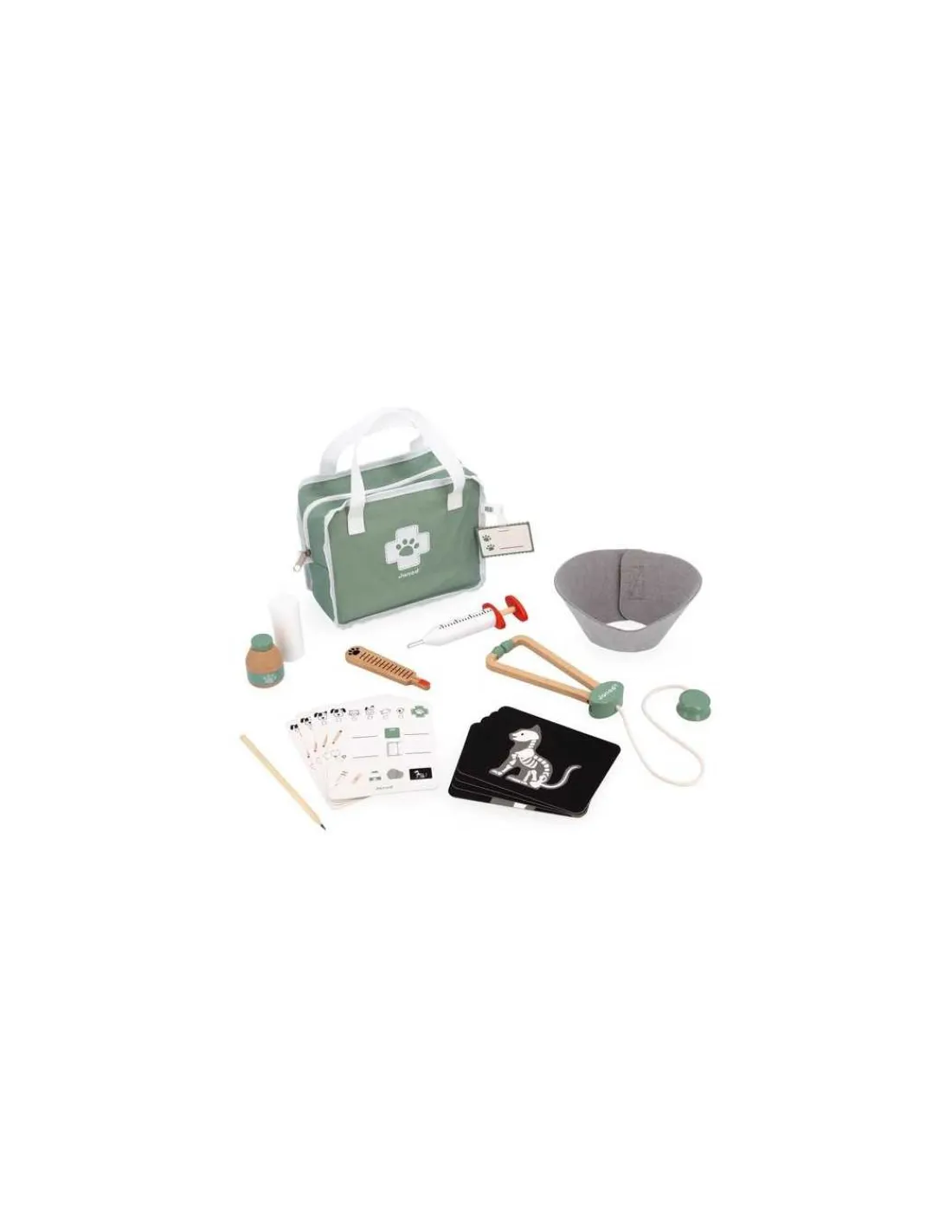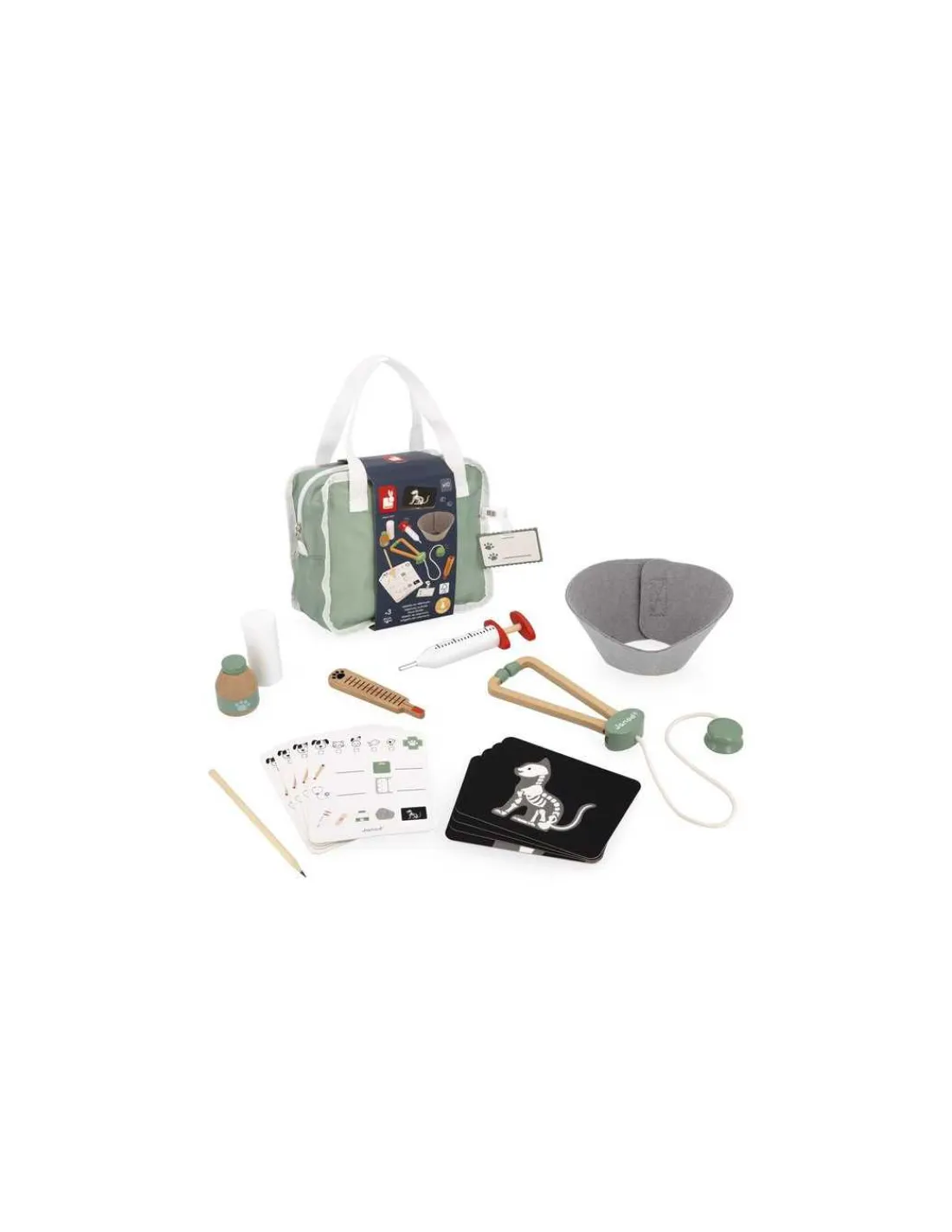 Ce coffret renferme 16 accessoires variés dont 4 accessoires en bois : 1 badge, 4 cartes ordonnances, 4 radios (celle d’un lapin, d’un chat, d’un poisson et d’un os cassé), 1 crayon, 1 bandage, 1 collerette en feutrine, un stéthoscope, une seringue, un thermomètre et un pot de crème en bois.