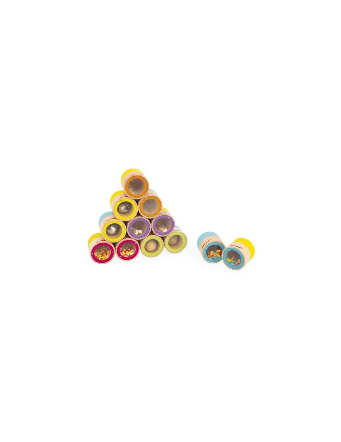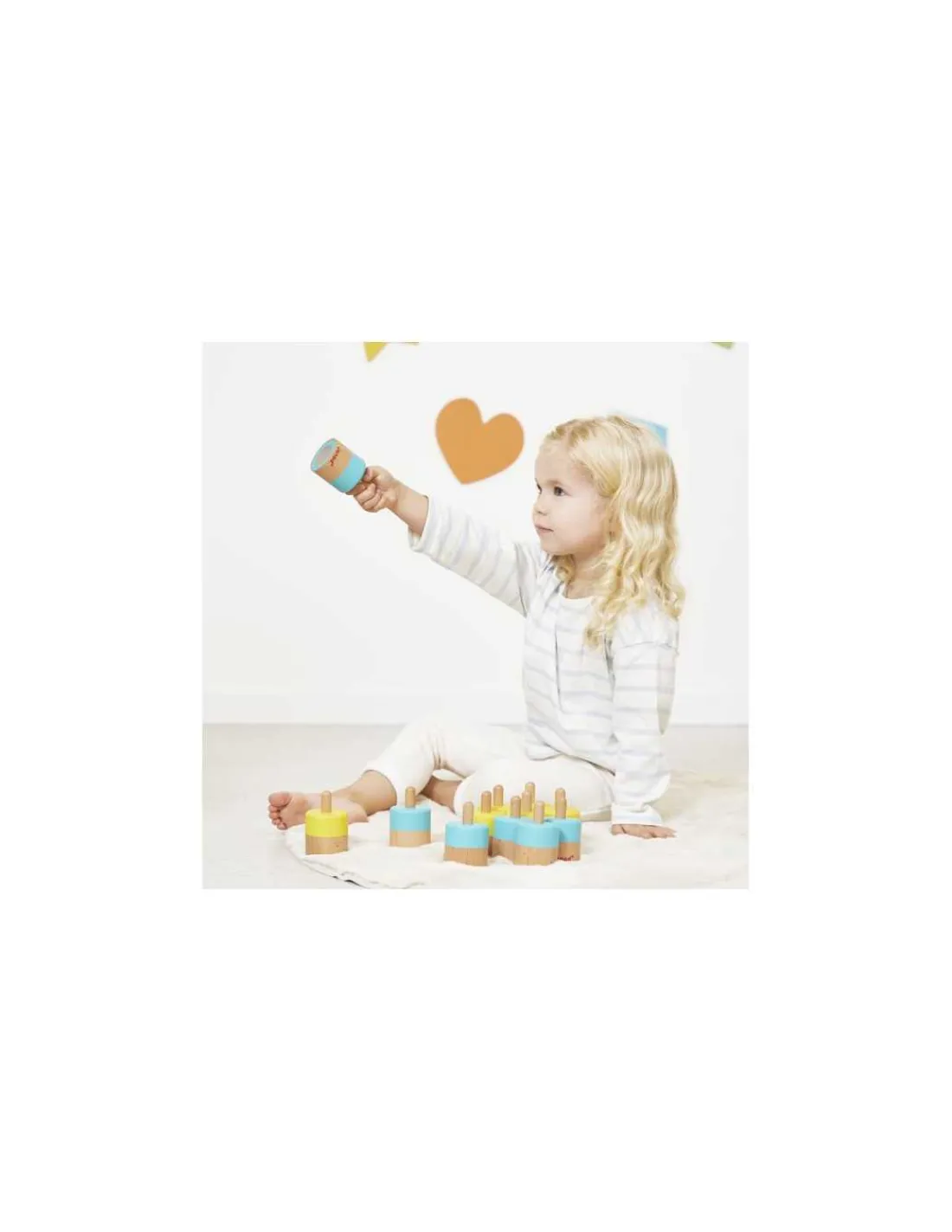 Ce jeu de mémoire invite les enfants à recomposer 6 paires en identifiant les sons qu’elles reproduisent. Chaque paire est composée d’une pièce jaune et d’une pièce bleue, représentant l’un des 6 sons distincts : une clochette, du sable, une bille en bois, des petits bouts de carton, des billes en plastique ou encore des petites pièces de bois.