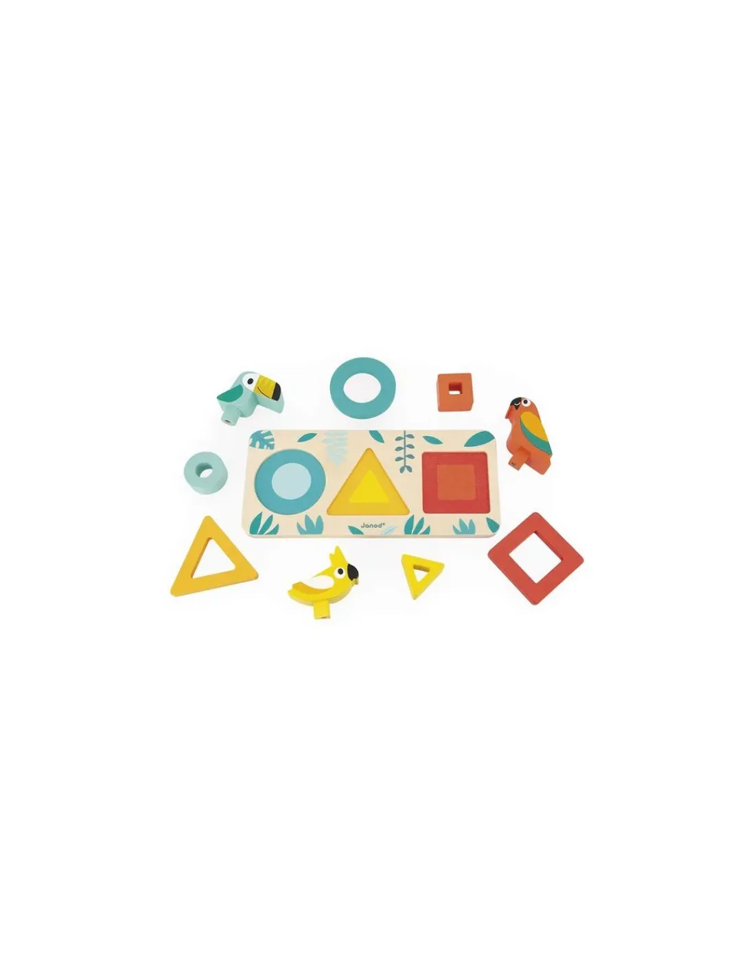 Découvrez mes premières formes de Janod, un jouet en bois éducatif de la collection Tropik sur les formes et les couleurs pour les enfants à partir de 1 an.