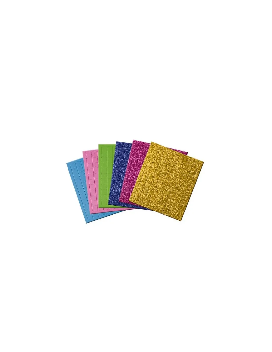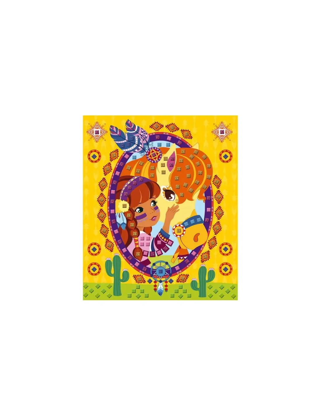 Un coffret contenant 3 tableaux à décorer, 600 mosaïques mousse autocollantes pailletées ou mates et 1 livret avec modèles et instructions.