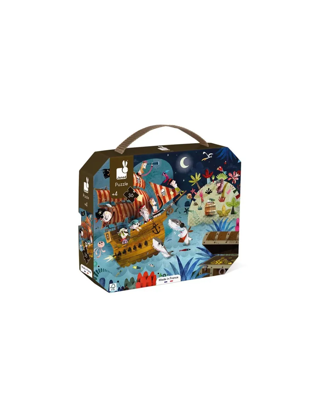 Découvrez le puzzle la chasse au trésor de Janod, un magnifique puzzle de 36 pièces en carton pour les enfants à partir de 4 ans. Un puzzle fabriqué en France avec une superbe illustration sur le thème des pirates.