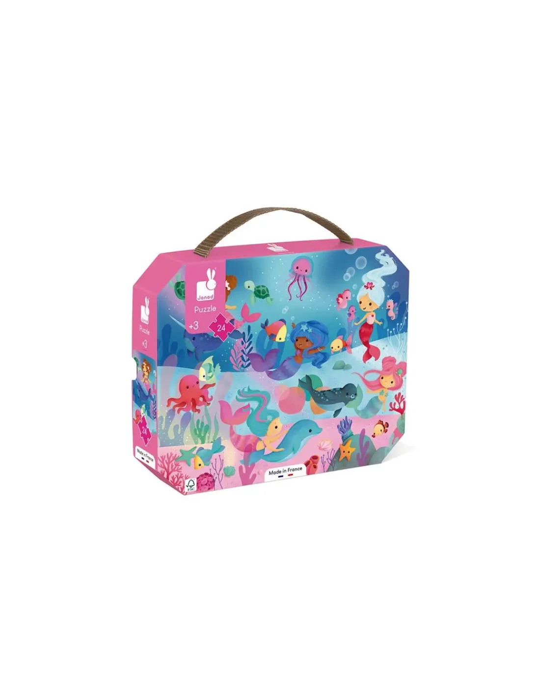 Découvrez le puzzle sirènes de Janod, un magnifique puzzle de 24 pièces en carton à partir de 3 ans. Nagez avec les sirènes et les animaux marins avec ce splendide puzzle fabriqué en France.