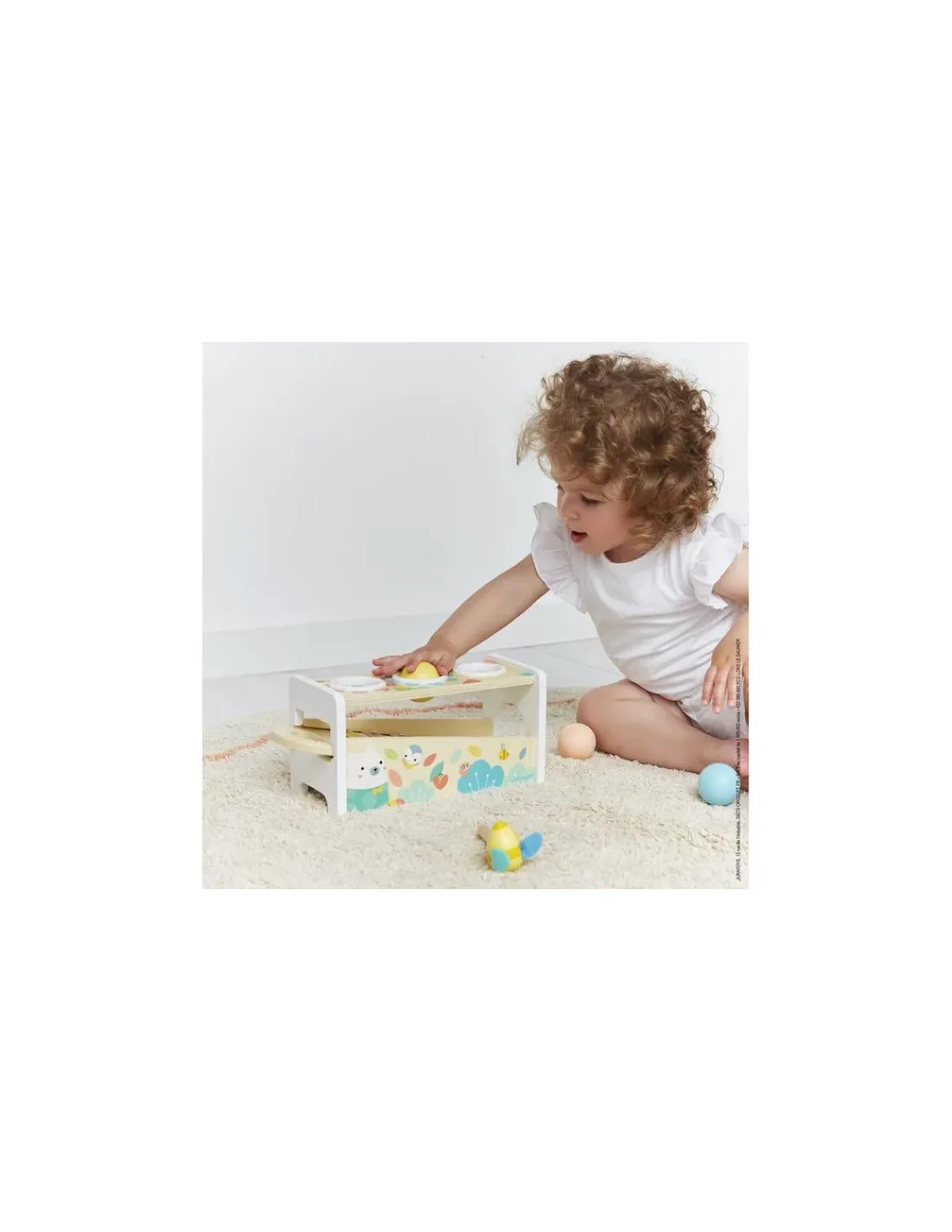 Le tap tap xylo pure de Janod est idéal pour développer la dextérité de bébé qui devra saisir les balles pour les placer dans les trous avant de frapper dessus avec le marteau.