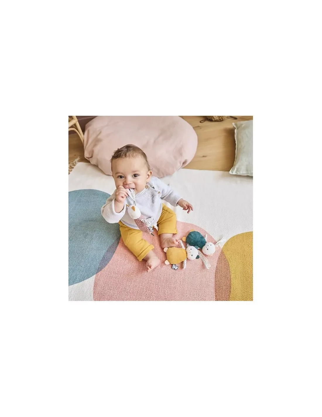Ce joli cadeau de naissance, idéal pour développer la préhension fine, promet de longs moments de découvertes sensorielles.