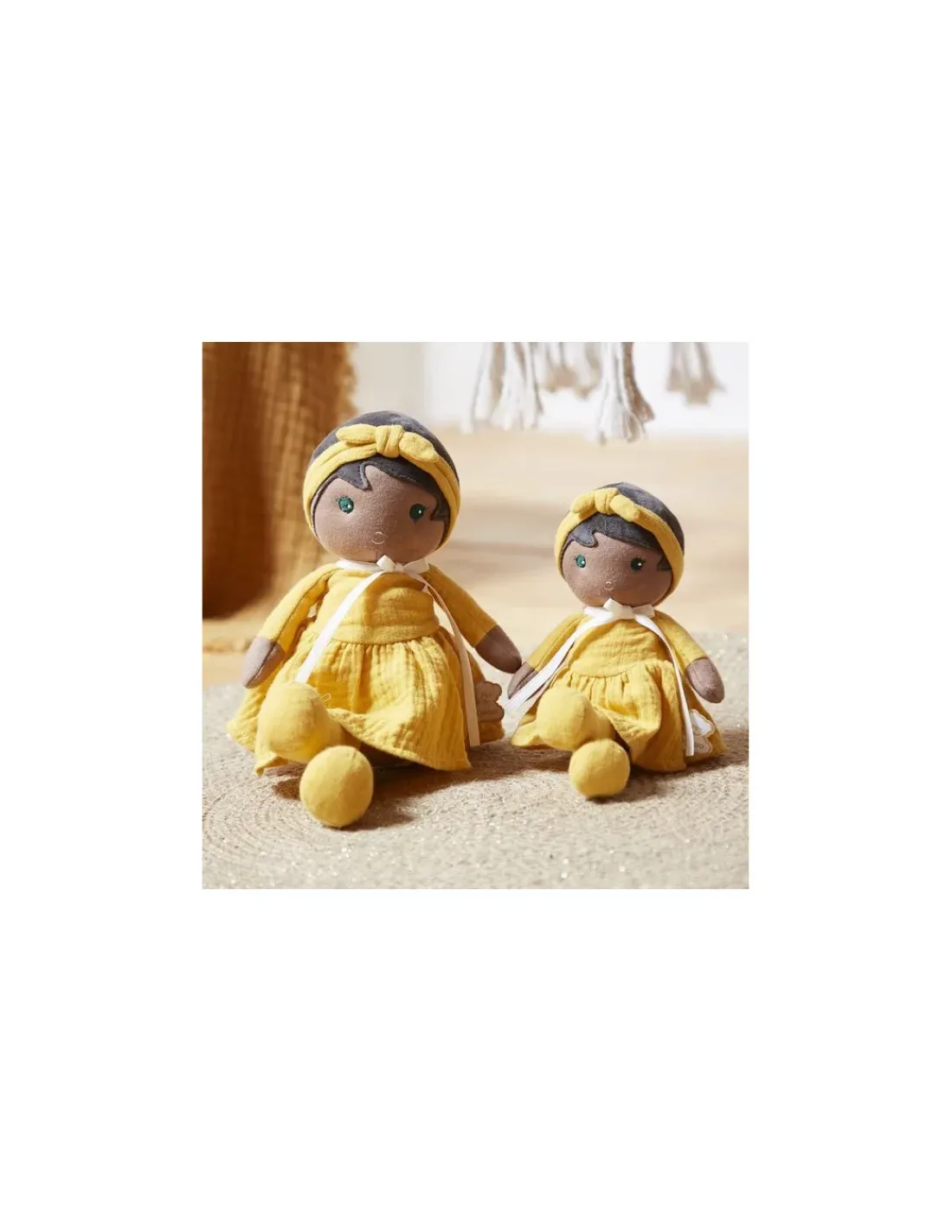 Voici Naomie, une jolie poupée métisse de 25 cm, vêtue d’une superbe robe jaune, d’un bandeau et de belles bottes assorties. Sa robe ample en mousseline, avec de délicates broderies, est avant tout confortable, tout en restant très douce à caresser par les petites mains.