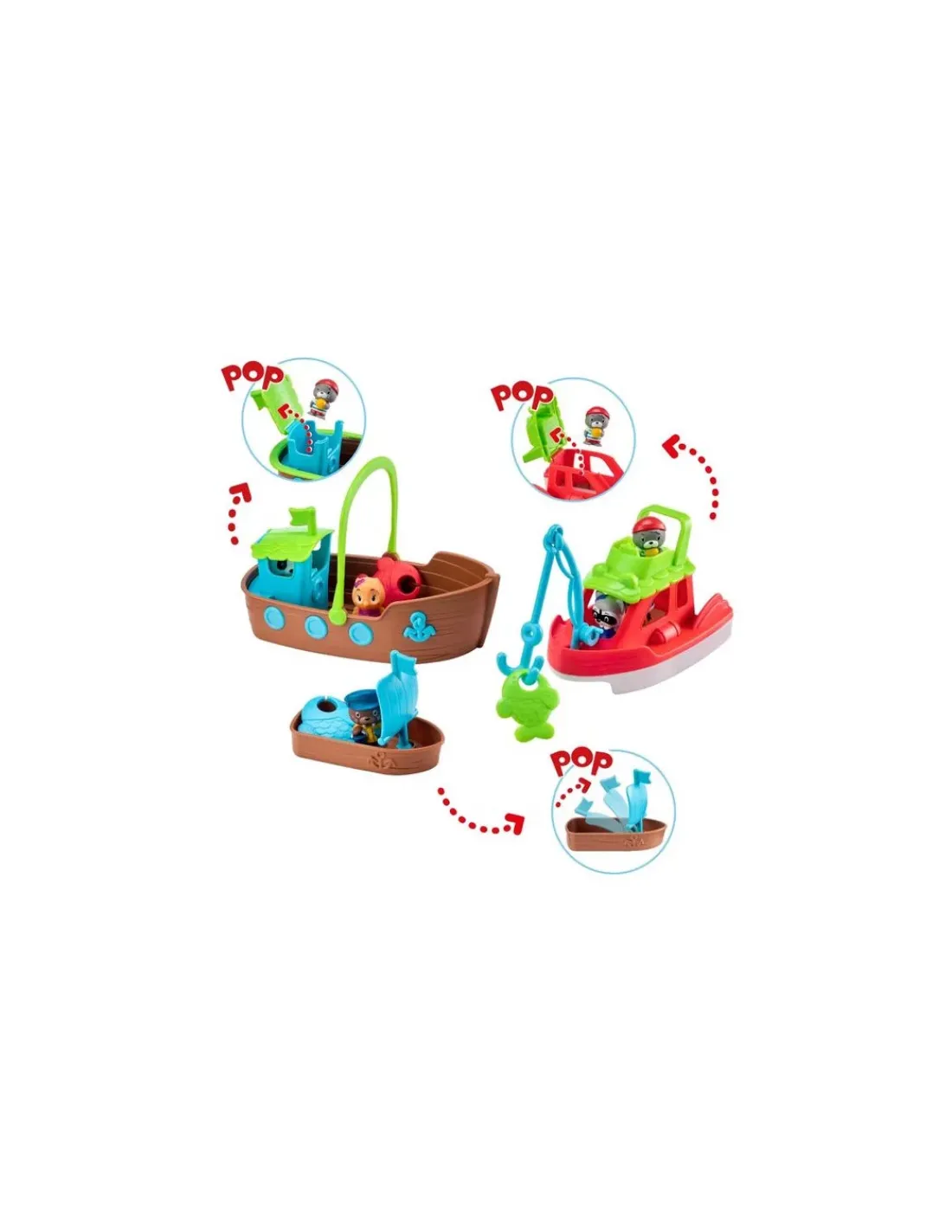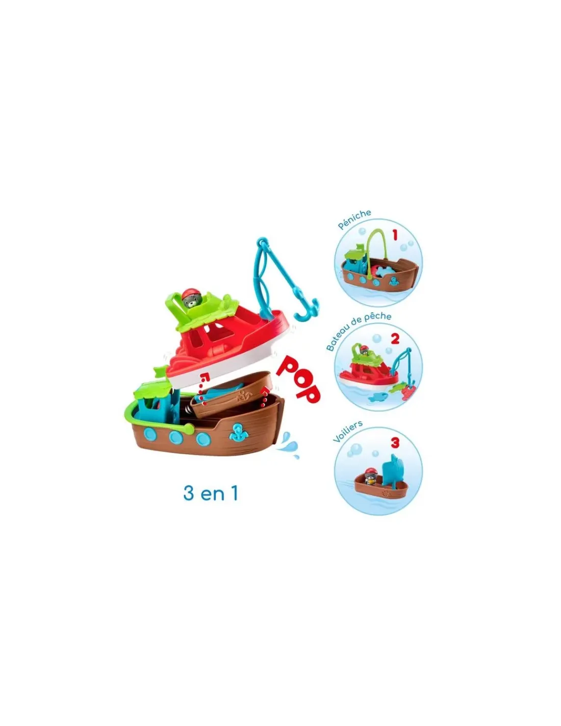 D’abord sous forme d’un bateau, « POP » il se transforme ensuite en une péniche, un bateau de pêche et un voilier offrant ainsi 4 possibilités de jeu. Ludique et amusant, la canne à pêche permet de pêcher 3 poissons. Chaque bateau possède une partie mobile à manipuler (voile, toits…). Pratique, la poignée permet un transport facile.