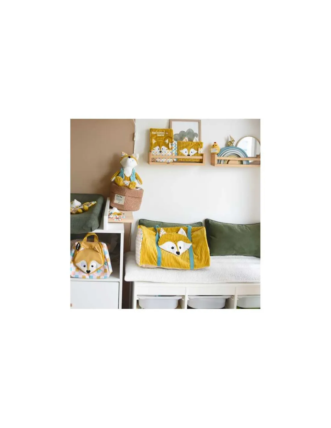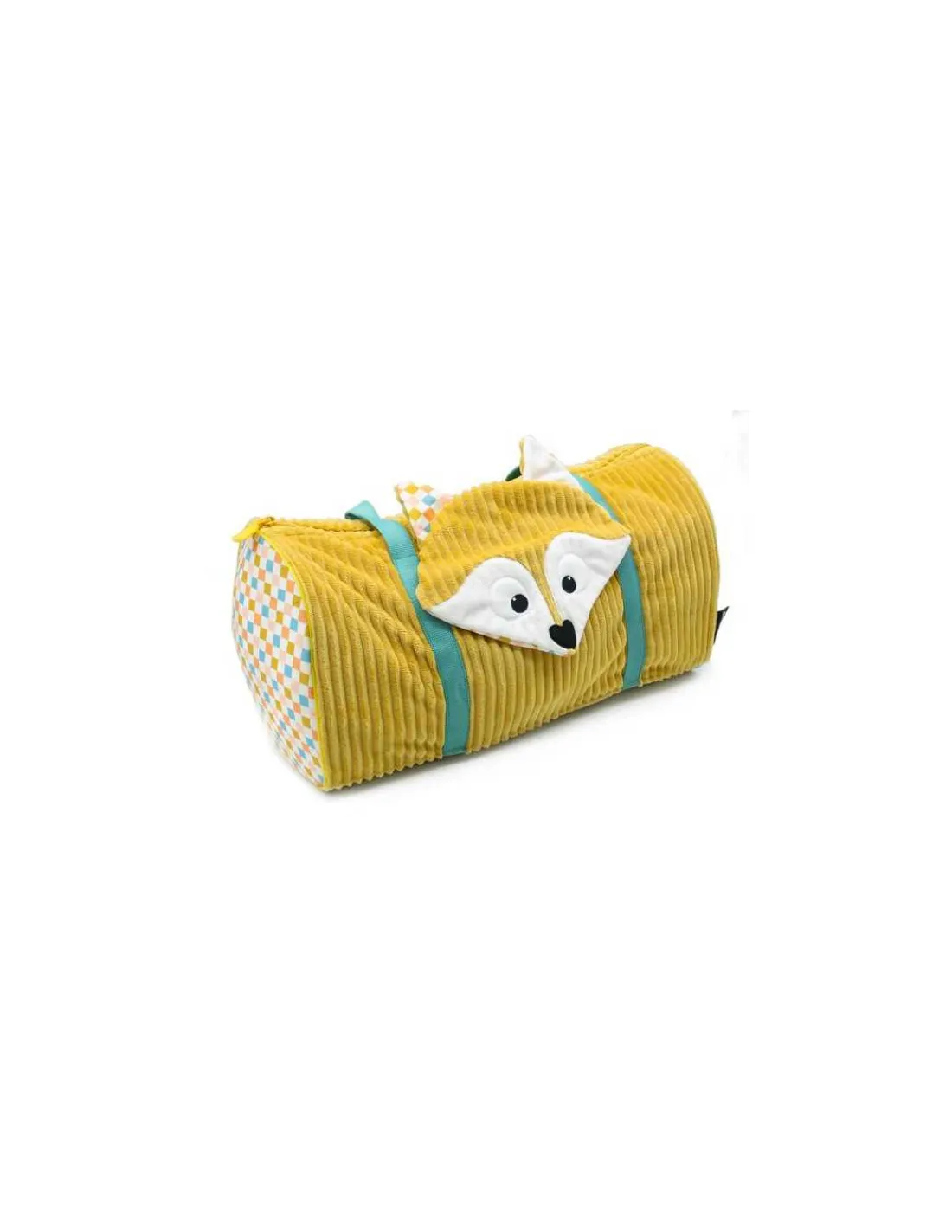 Découvrez le sac de voyage Cyranos le renard de Déglingos, un grand sac bowling en velours côtelé et tissu imprimé pour emporter toutes ses affaires pour partir en week-end ou en vacances.