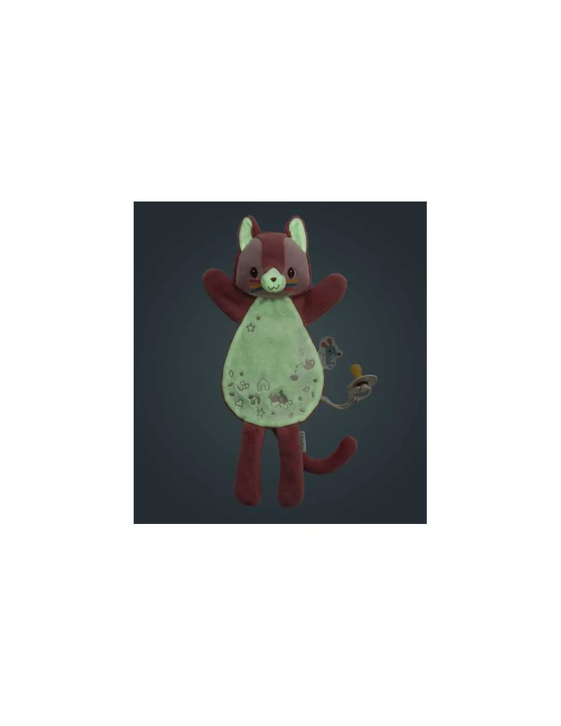 Jeanne le chat, douce mais intrépide, est le compagnon parfait pour les tout-petits dès la naissance. En plus de réconforter votre bébé, elle se transforme en marionnette amusante : glissez vos doigts dans ses bras et derrière sa tête pour le faire bouger, danser et parler. Parfait pour apaiser pendant la journée, elle devient également un compagnon pratique la nuit, brillant dans le noir pour retrouver facilement la tétine.