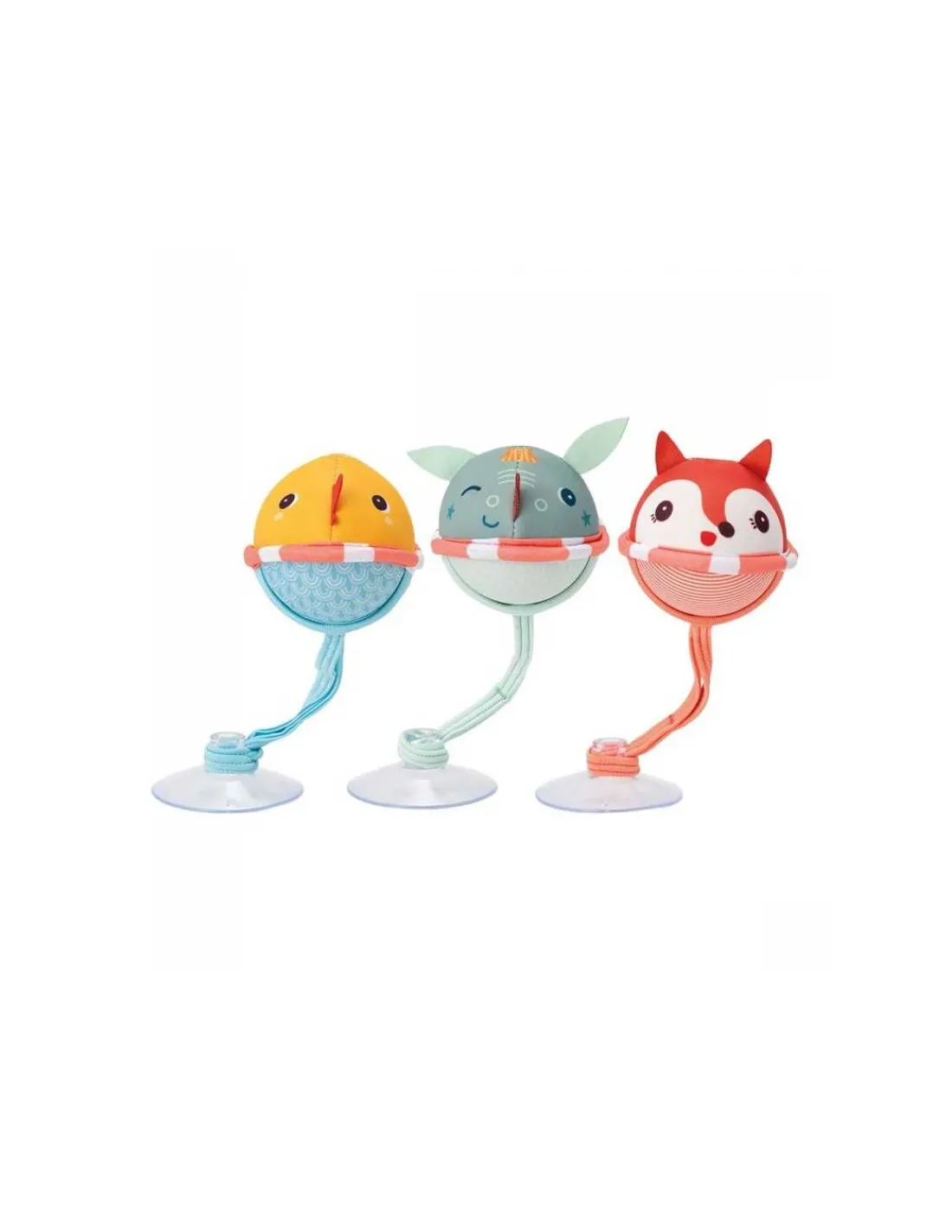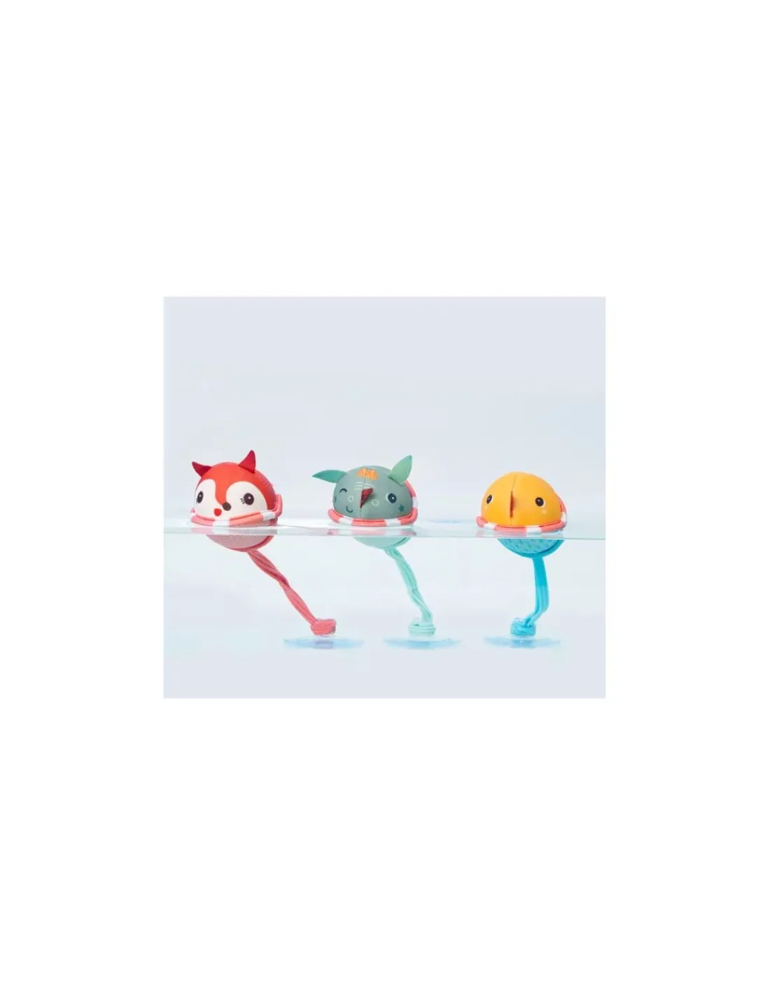 Joe, Alice et Gaspard flottent dans leur bouées colorées dans le bain aux cotés des plus petits. Les 3 balles de bain en néoprène se fixent avec des ventouses sur la paroi du bain et dansent sur l’eau, sous les yeux de bébé.