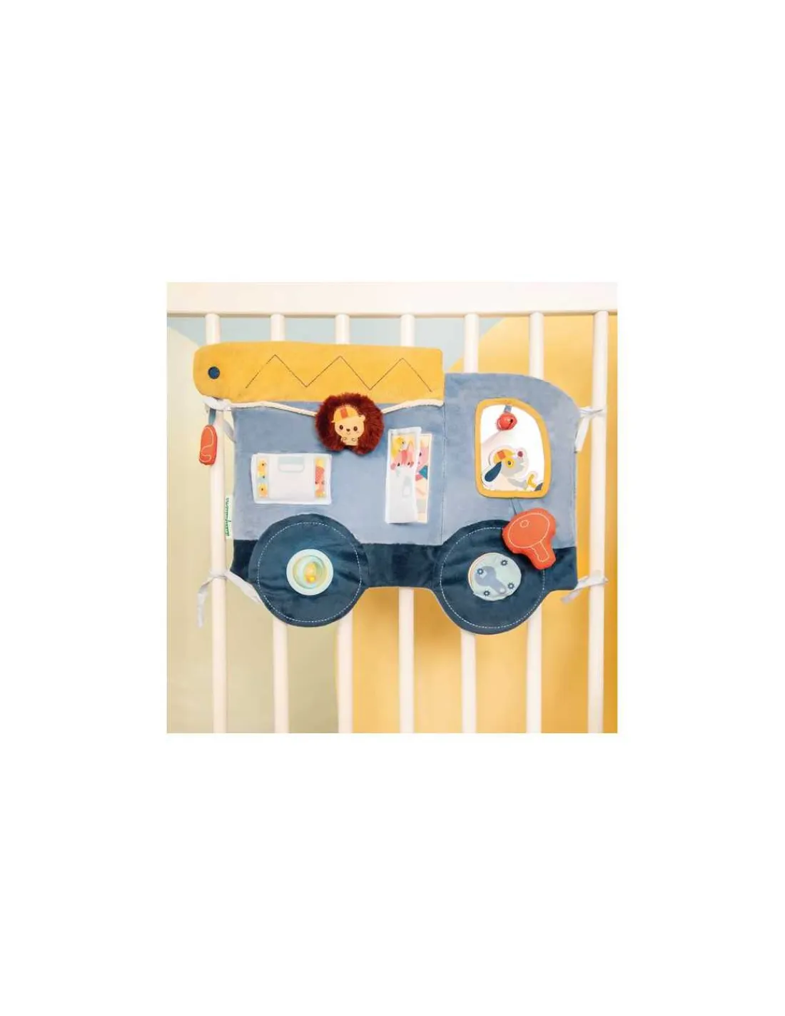 La clochette retentit… direction le prochain chantier ! On démarre le camion avec la grosse clé et c’est parti pour la découverte de plein d’activités stimulantes. Ce panneau s’accroche facilement au parc de bébé.