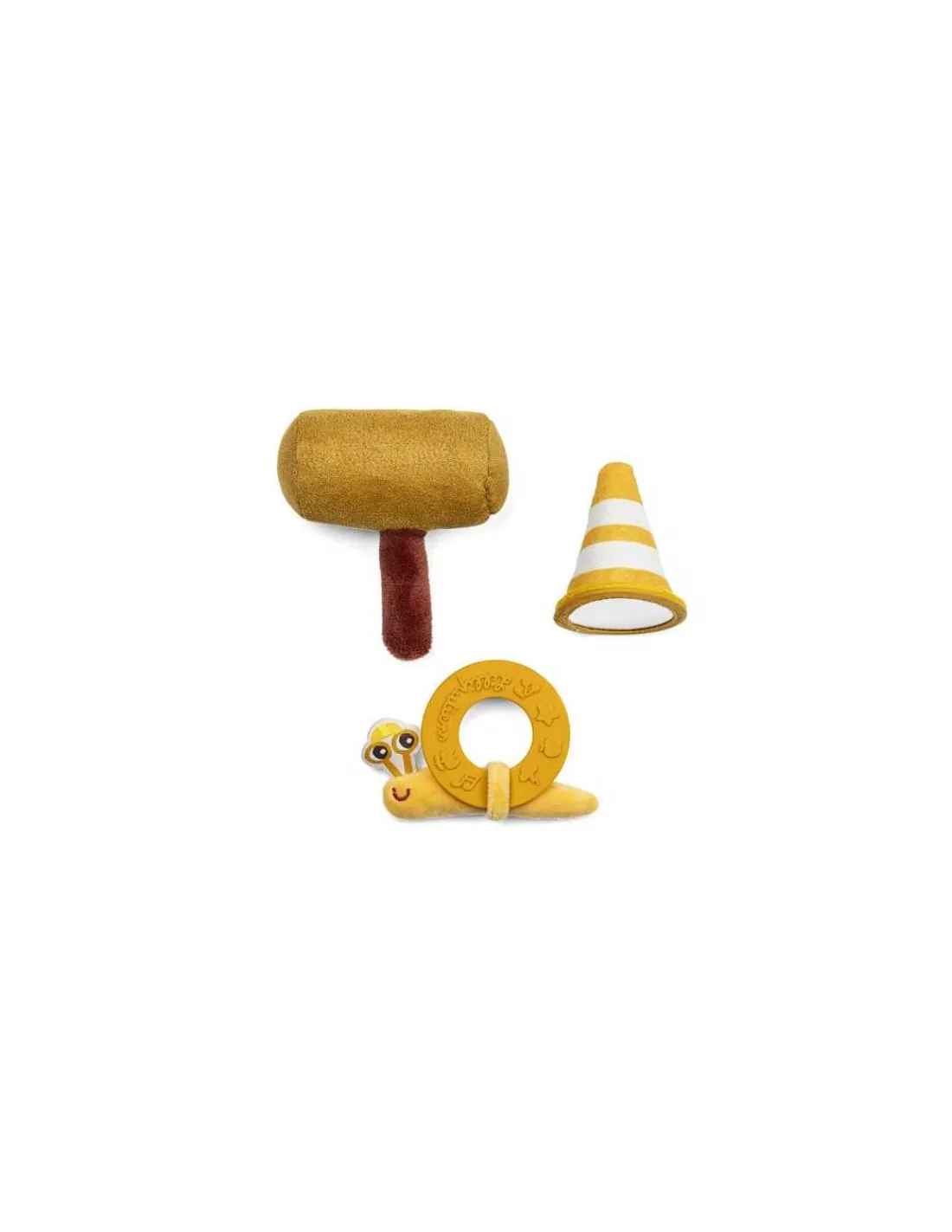 Jules le bricoleur emmène toujours son kit avec lui. Grâce à sa grande poche ventrale, on peut découvrir différents objets cachés. Un cône avec un miroir, un anneau de dentition en silicone sur le dos d’un escargot et un marteau au bruit de papier. Ce bricoleur stimule la motricité fine, l’audition et met l’imagination au défi.