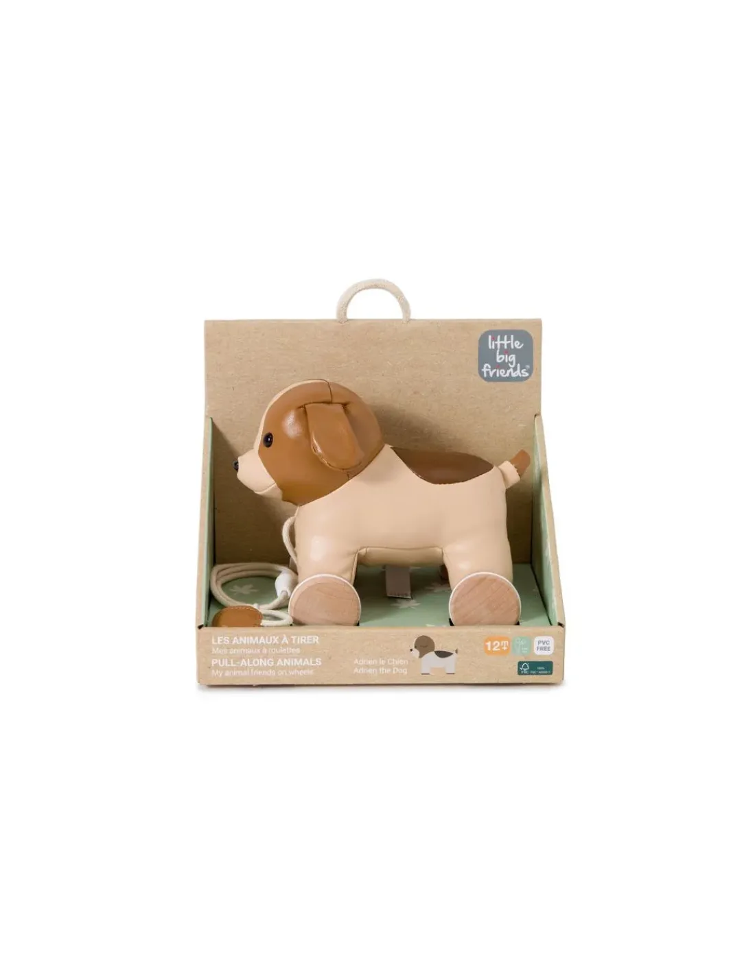 Découvrez Adrien le chien à tirer de Little Big Friends, un jouet à tirer à la texture souple pour les enfants à partir de 1 an. Un joli chien à tirer nommé Adrien que votre enfant s’amusera à promener dans toute la maison.