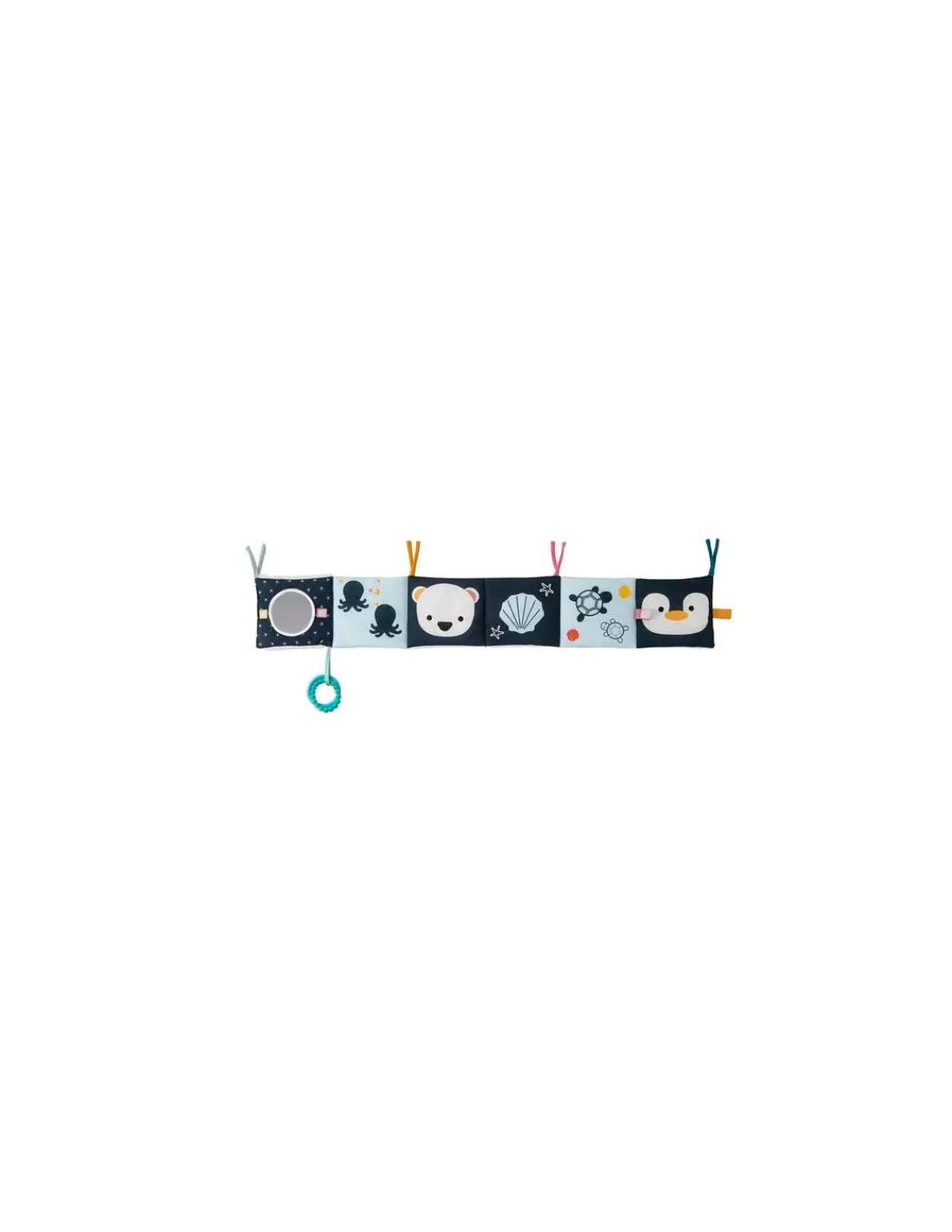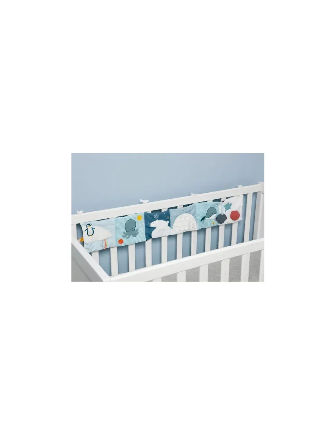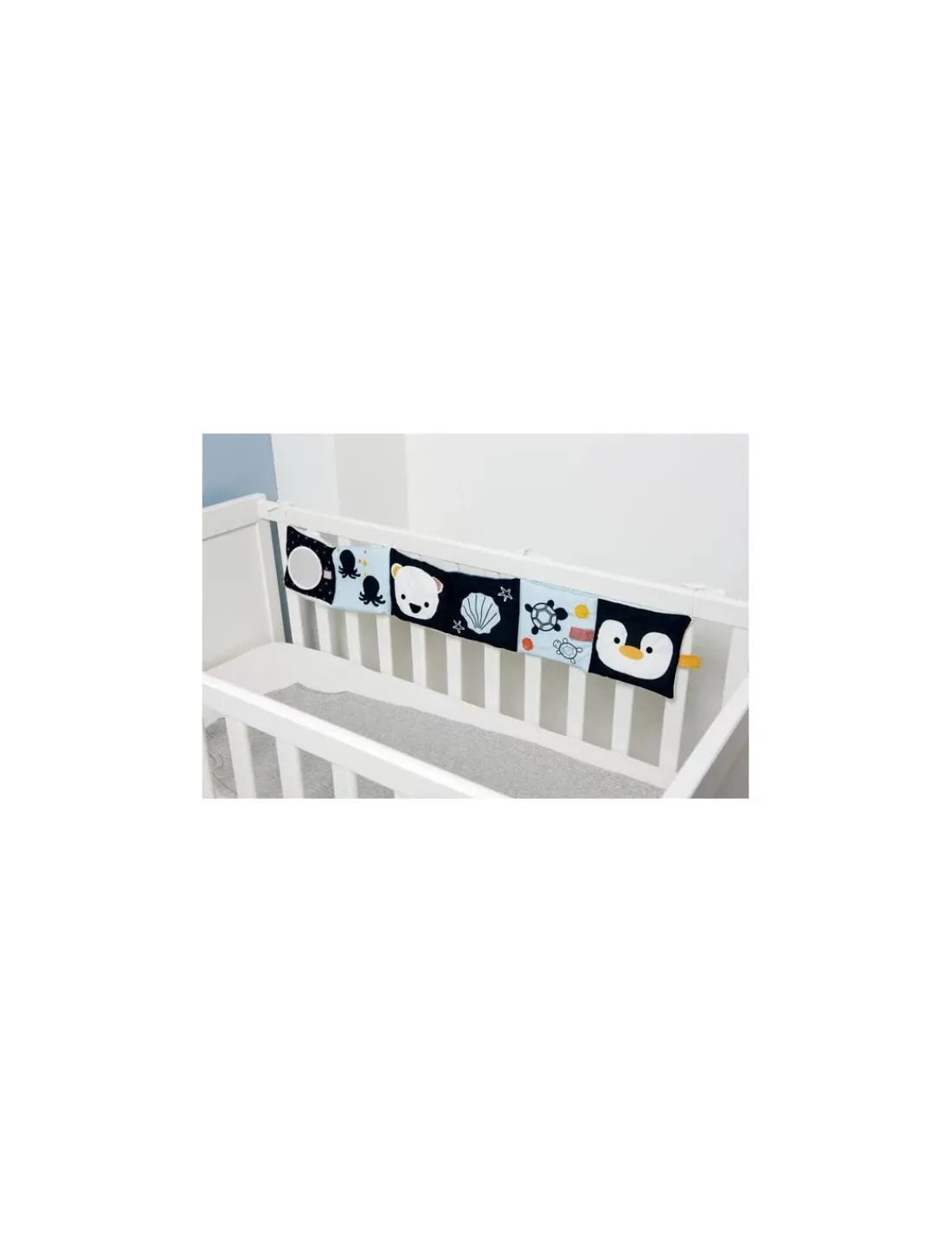 Déplié il se noue aux barreaux du lit ou de parc. Avec une face bicolore pour le premier âge, idéale quand bébé ne voit que les contrastes de couleur, et une face qui regorge de petites surprises cachées et de jeux de matière (3 cordons, un ours couineur, un pingouin caché, un coquillage bruissant…)