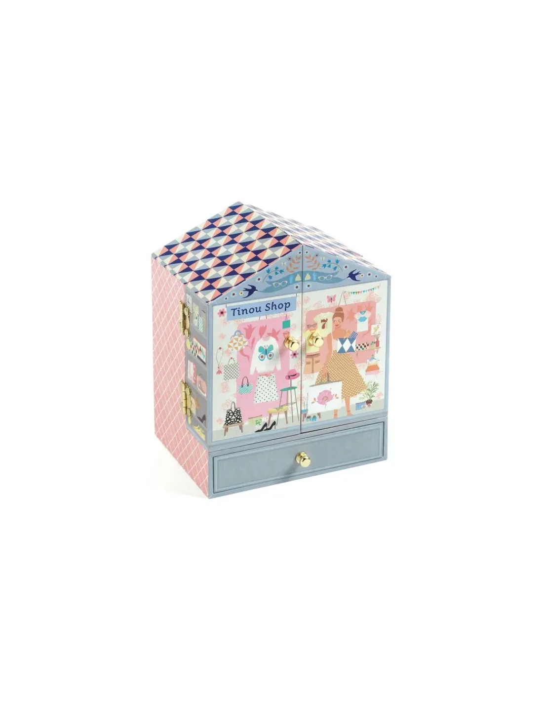Découvrez la boite à bijoux Tinou Shop de Djeco, une boite à musique et une armoire à bijoux à offrir en cadeau. Une boîte à musique joliment illustrée avec trois tiroirs pour ranger ses bijoux et secrets.
