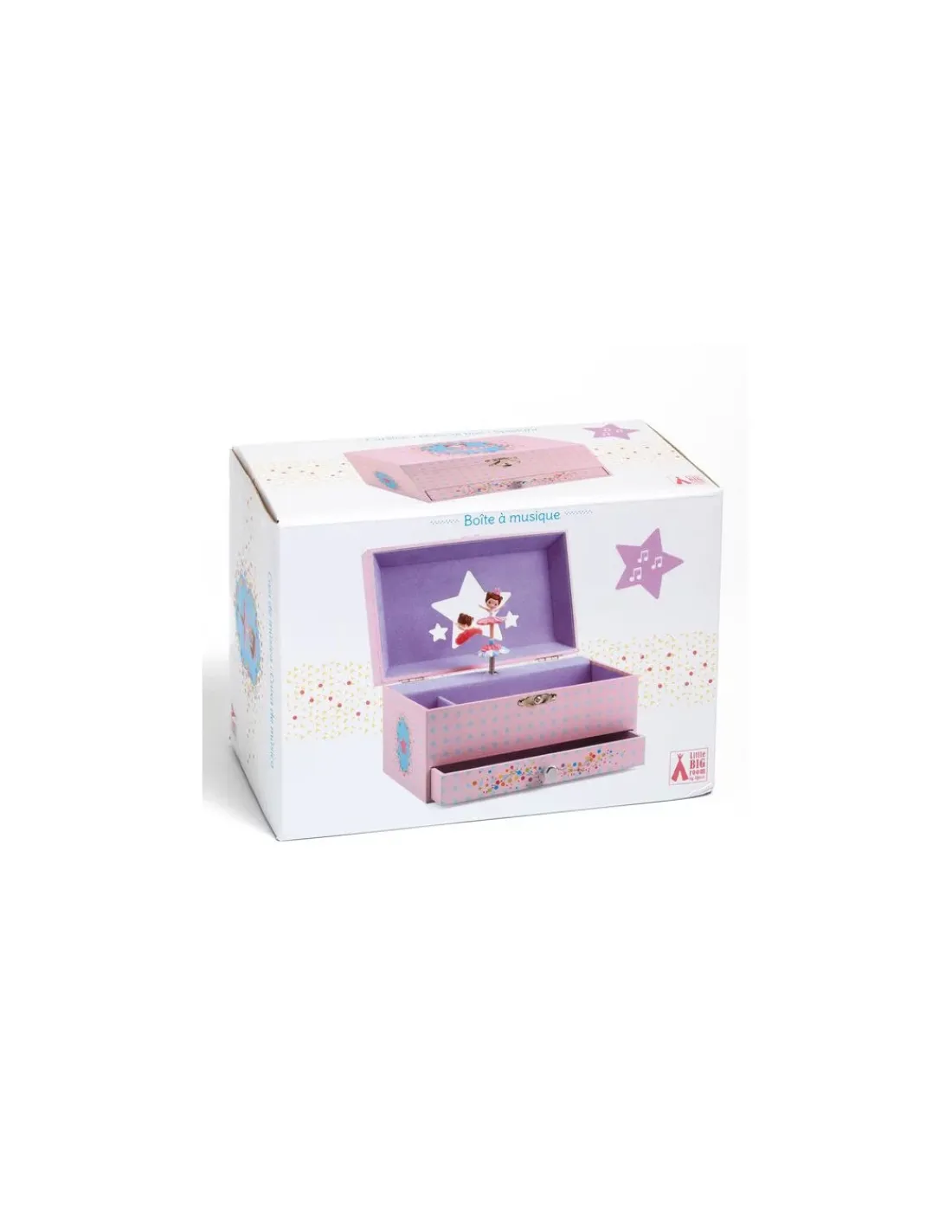 Une jolie boite à musique Djeco avec un grand compartiment pour ranger tout ses trésors, un compartiment pour ranger ses bagues et un tiroir pour ses secrets. Votre enfant s’admirera devant le miroir silhouetté en forme d’étoile et regardera danser la ballerine qui s’animera en musique à l’ouverture de la boite.
