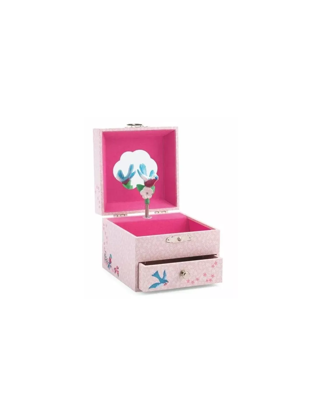 Une petite boite à musique Djeco avec tiroir où un oiseau pinson se mettra à danser lorsque vous actionnerez la musique. Le tiroir et le compartiment lui permettront de ranger bijoux, trésors et secrets… et de s’admirer dans le petit miroir devant lequel danse l’oiseau.