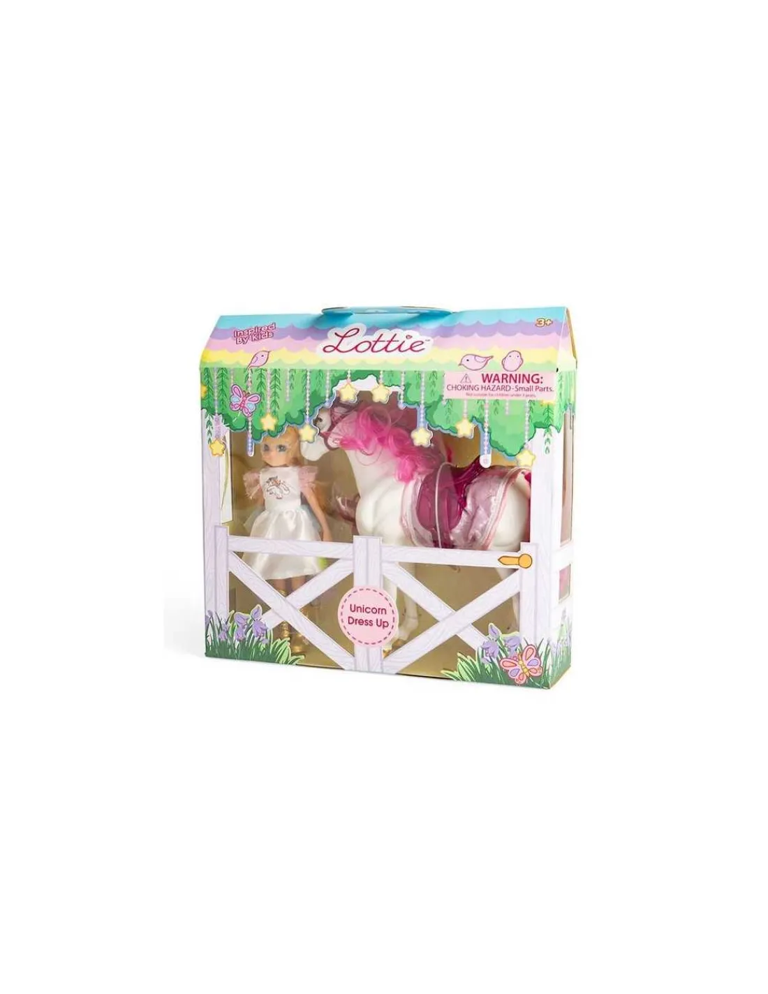 Découvrez le coffret licorne et poupée de Lottie comprenant une poupée mannequin de 18 cm et son cheval licorne, un cadeau parfait pour les enfants à partir de 3 ans.