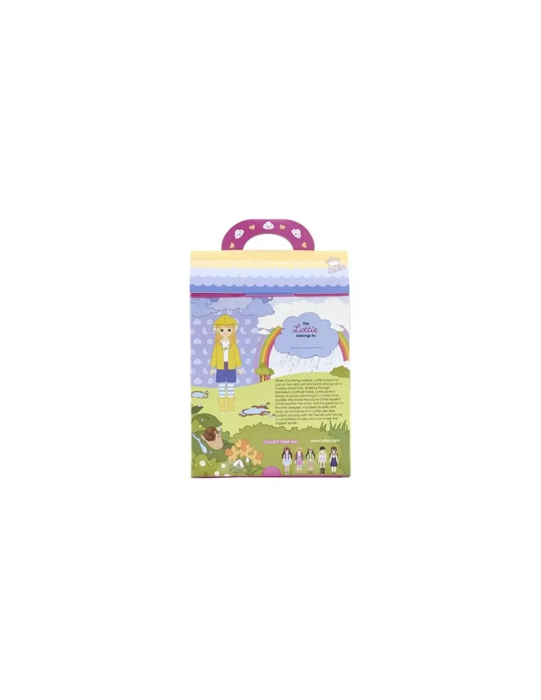 Cette poupée Lottie est présentée dans une « boîte sac pour poupée » à offrir, illustrée et collectionnable avec une petite poignée pour encourager sa réutilisation et sa portabilité.