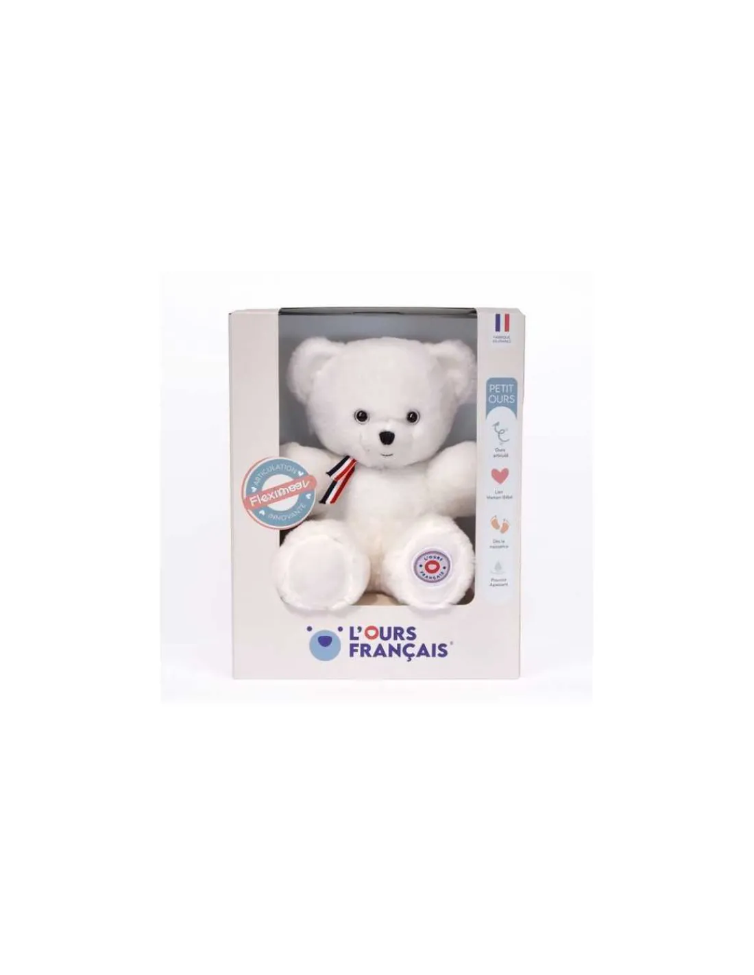 Découvrez la Peluche petit ours blanc L’ours français 25 cm, une adorable peluche fabriquée en France à offrir à bébé dès la naissance. Un ours articulé traditionnel, subtilement habillé d’un ruban bleu blanc rouge pour honorer le savoir-fabriquer français.