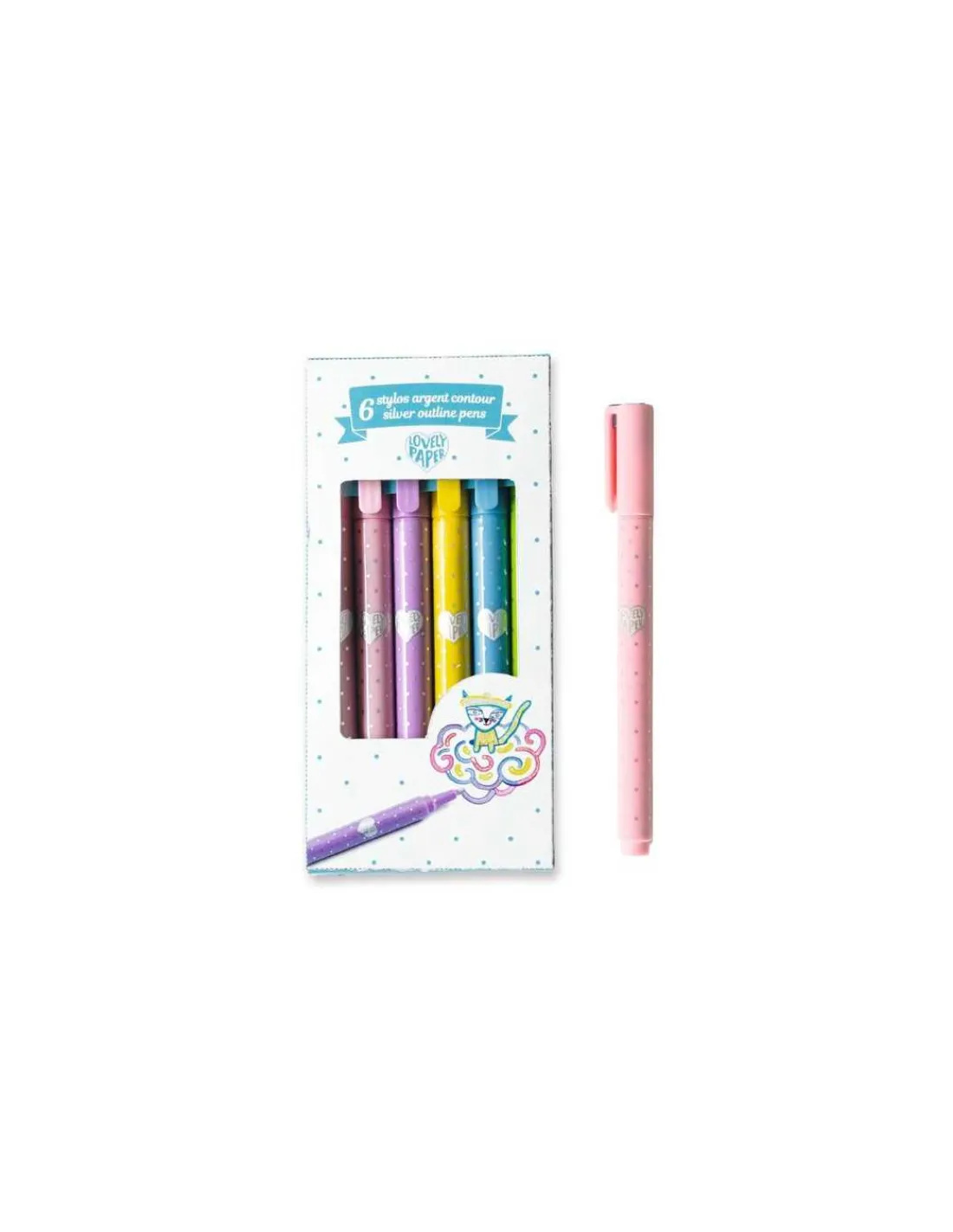 Découvrez les 6 stylos argent contour de Lovely Paper by Djeco, un étui de 6 stylos argentés avec contour pour écrire, dessiner et pour sublimer vos créations avec de jolies couleurs : rouge, jaune, vert, bleu, rose et violet.