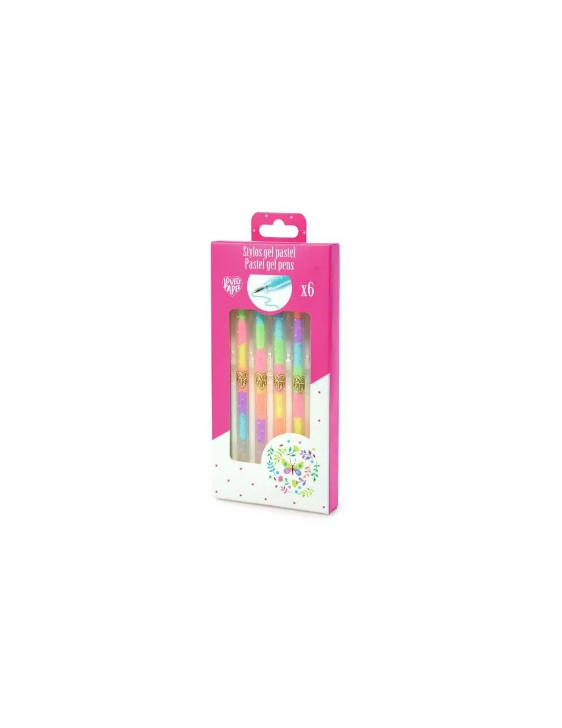 Découvrez les 6 stylos gel pastel de Lovely Paper by Djeco, un étui de 6 stylos gel aux couleurs de l’arc-en-ciel. Chaque stylo comporte 6 couleurs qui changent au fur et à mesure de son utilisation. Un format idéal à glisser dans un sac à main, dans un sac à dos pour partir en week-end et donner de la lumière à vos écrits.