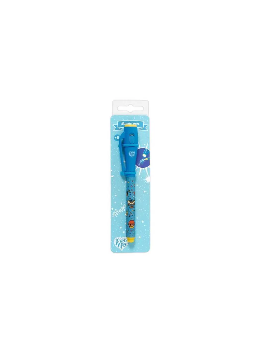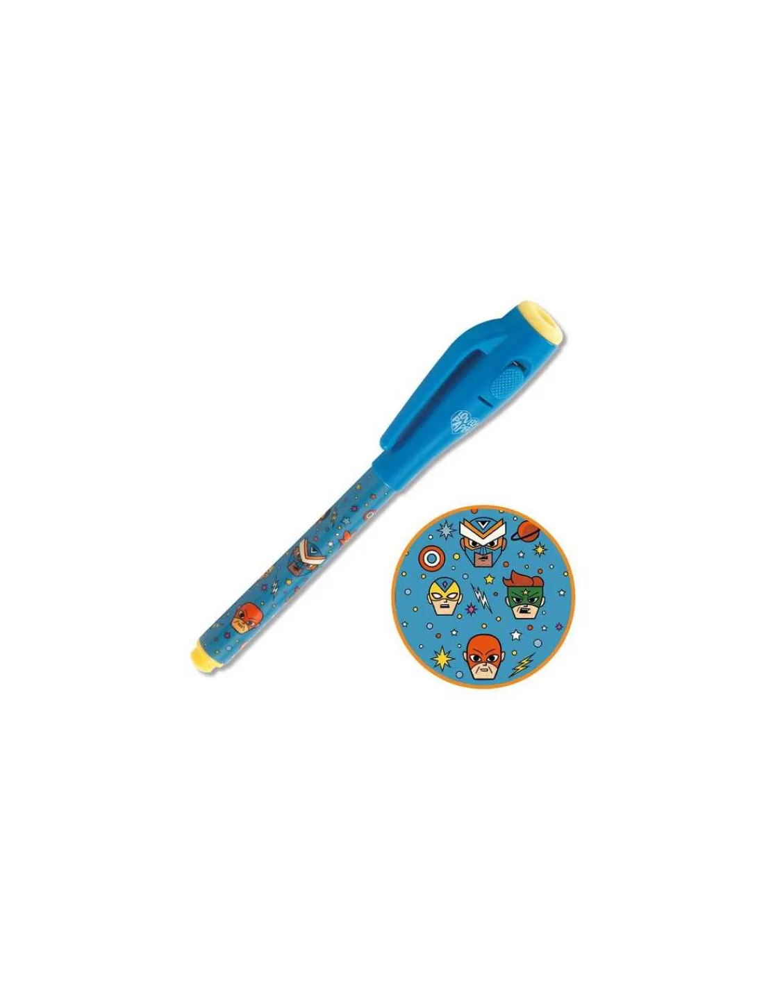 Actionnez le bouton on/off et rédigez vos écrits secrets. Un crayon bleu et jaune sur le thème des super-héros, qui trouvera sa place dans toutes les trousses et fera un cadeau original pour les anniversaires.