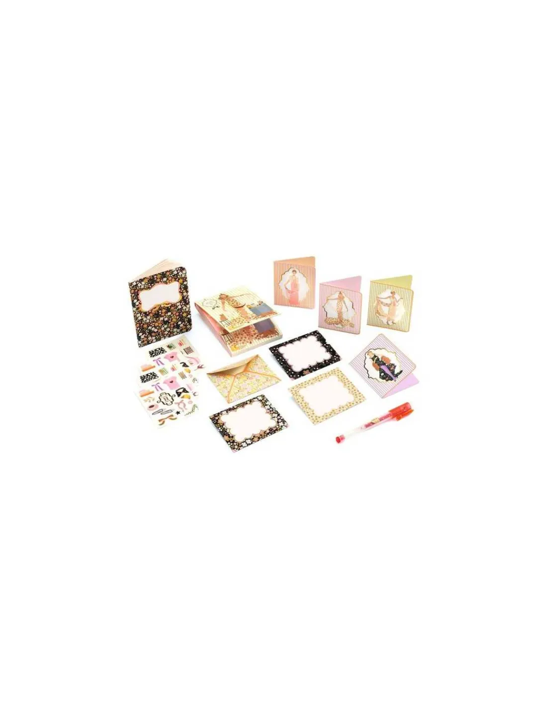 Ce set de correspondance comprend 1 coffret valise, 1 cahier, 1 bloc-notes, 1 stylo gel rose, 4 enveloppes, 4 cartes d’invitation.