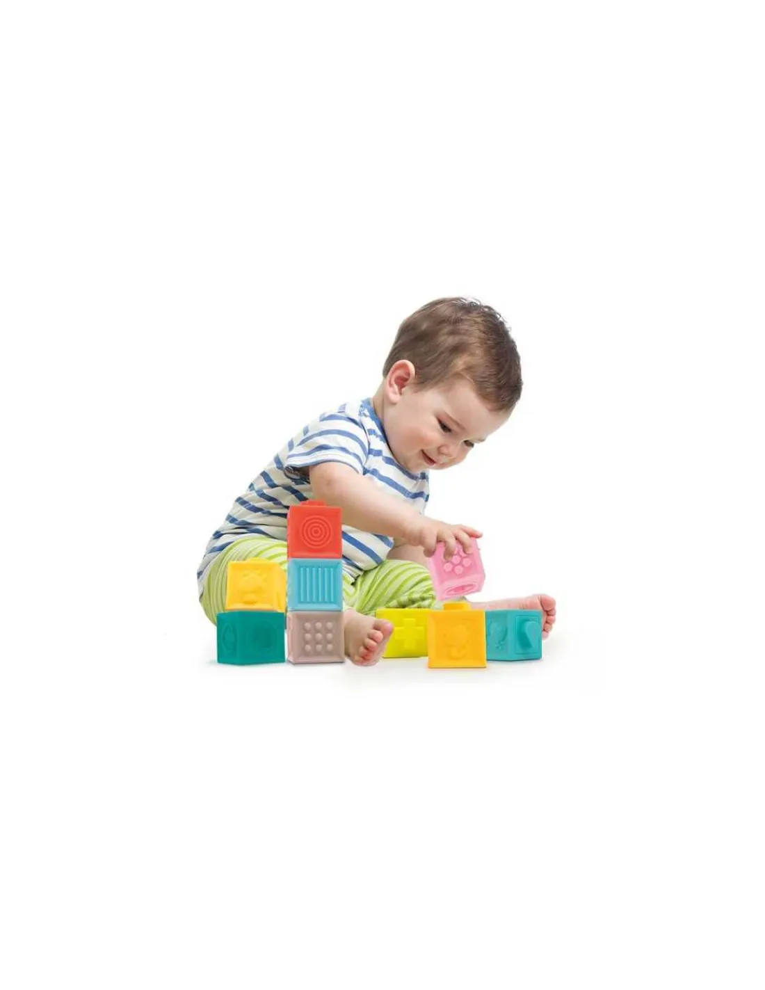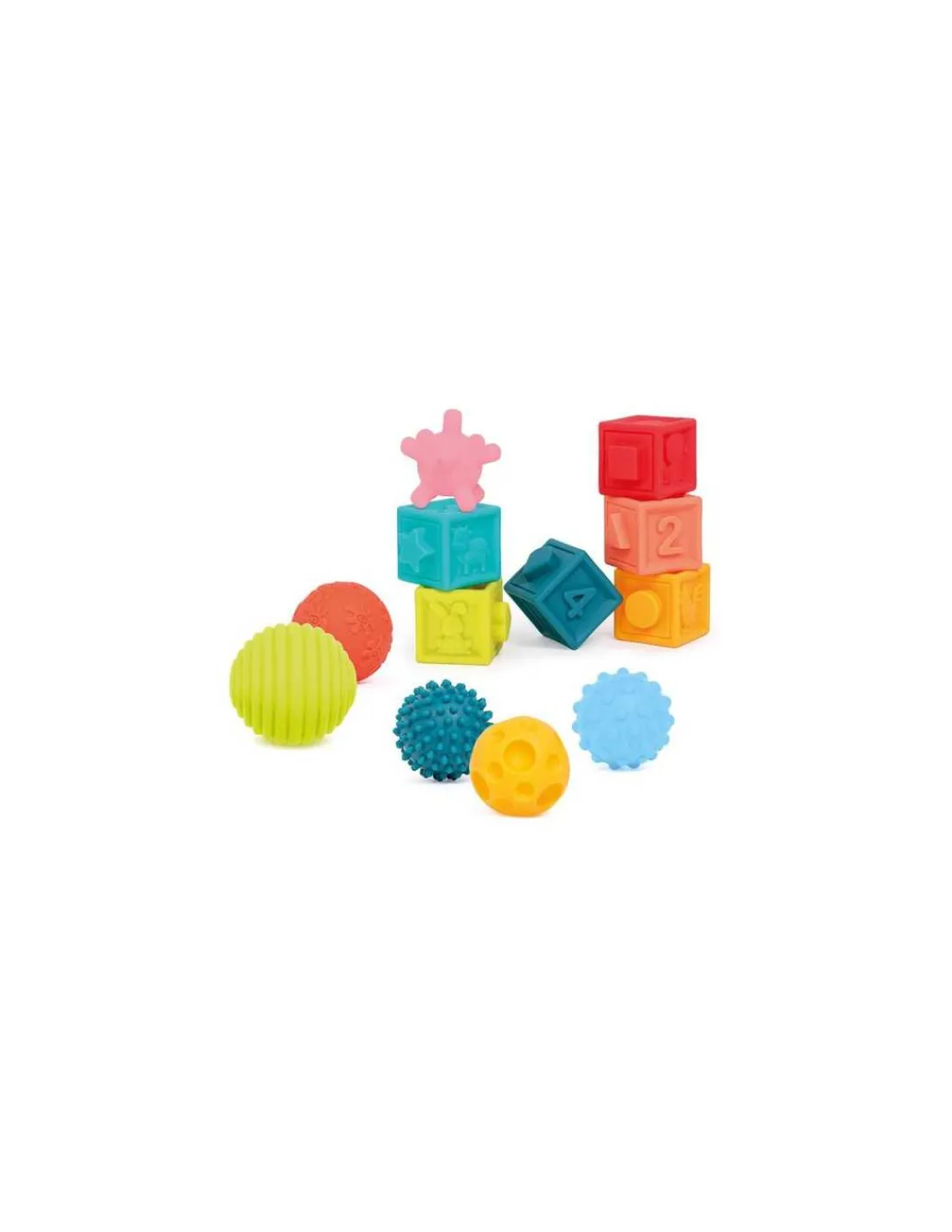 Laissez bébé explorer les différentes textures en les touchant avec les mains et les pieds pour stimuler son sens du toucher. Ces balles et cubes souples peuvent aussi être utilisés dans l’eau pour rendre le bain encore plus ludique.