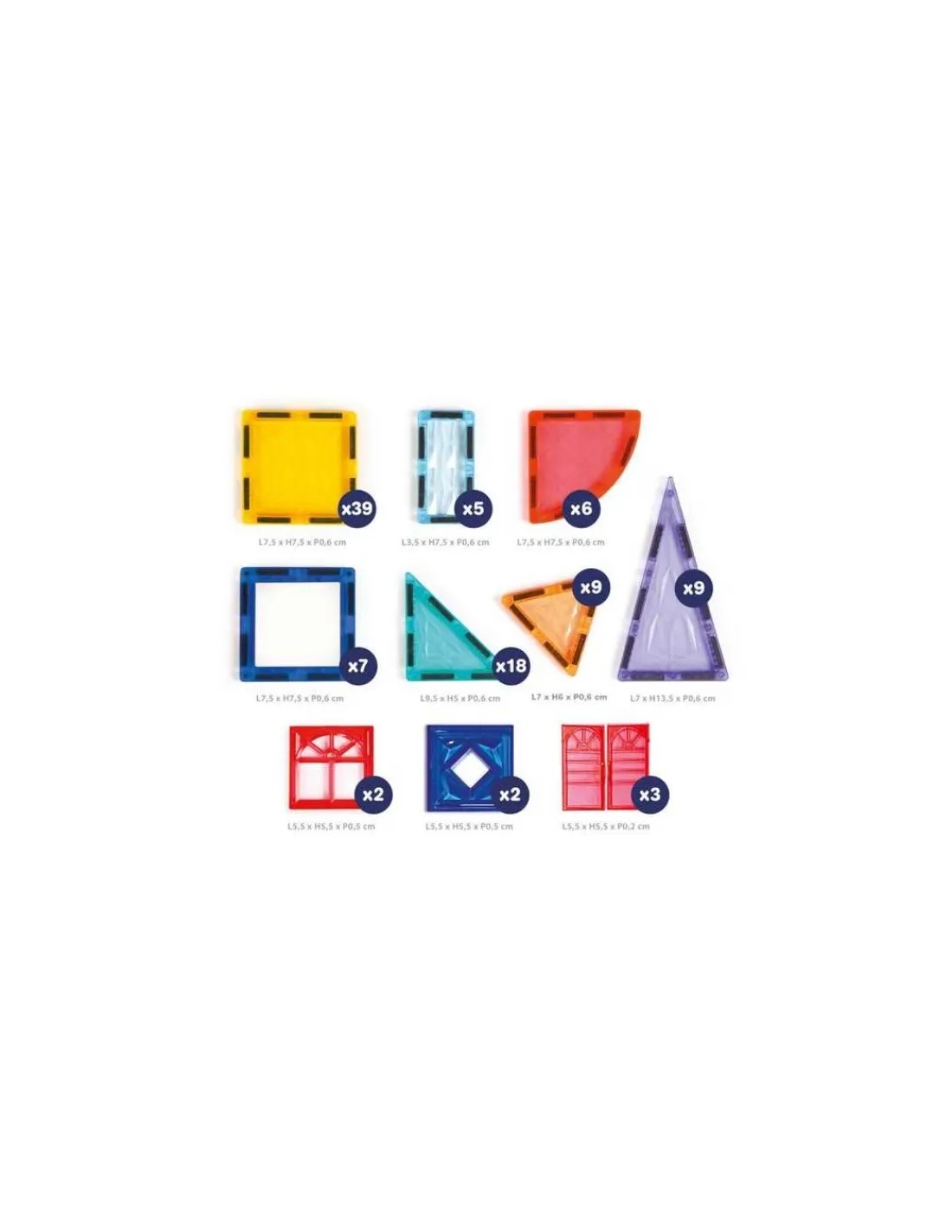 Un jeu de construction aimanté créatif et éducatif. Cette valisette pratique réunit 100 pièces magnétiques colorées et transparentes (carrés, triangles, rectangles, fenêtres, quarts de cercle) pour imaginer des constructions en 2D et en 3D.
