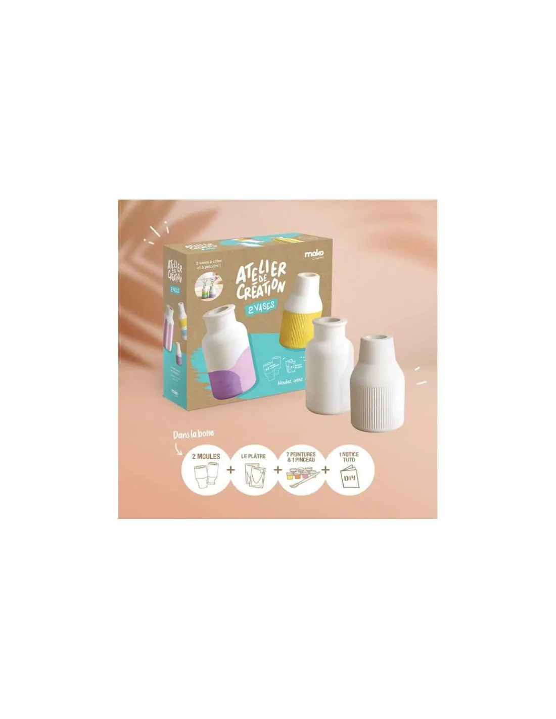 Ce coffret créatif contient 2 moules en silicone (vase strié et vase lisse), 2 sachets de 300g de plâtre, 7 pots de peinture « couleurs pastels » de 5 ml, 1 pinceau et 1 notice.