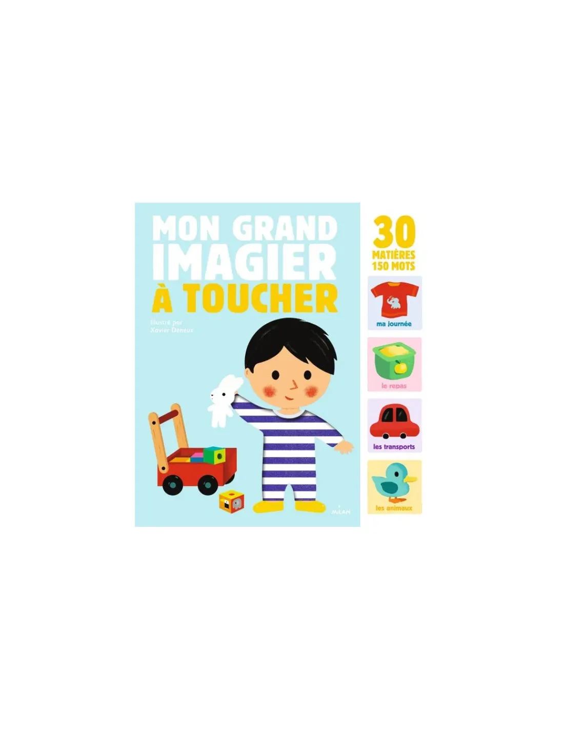 Avec ce livre incontournable, Milan propose aux enfants bien plus qu’un imagier. Au fil des pages et des univers, c’est une véritable petite encyclopédie, composée de plus de 150 mots à nommer et agrémentée de 30 matières qui leur permettra de découvrir le monde qui les entoure. Toucher, caresser, nommer, observer… Un livre indispensable pour tous les petits curieux.